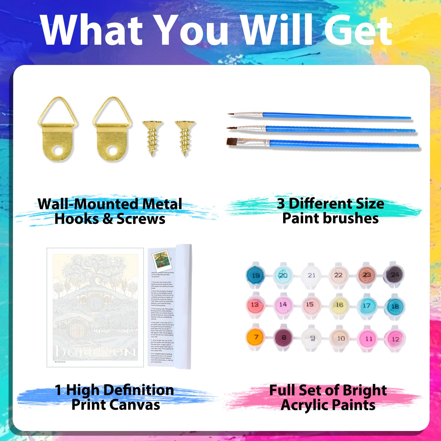 - [Complete Paint by Numbers Kit] Our house paint by numbers kit contains everything you need, including waterproof canvas, acrylic paint, nylon brushes, line drawing, reference diagrams, metal hooks. Bring you a pleasant painting experience