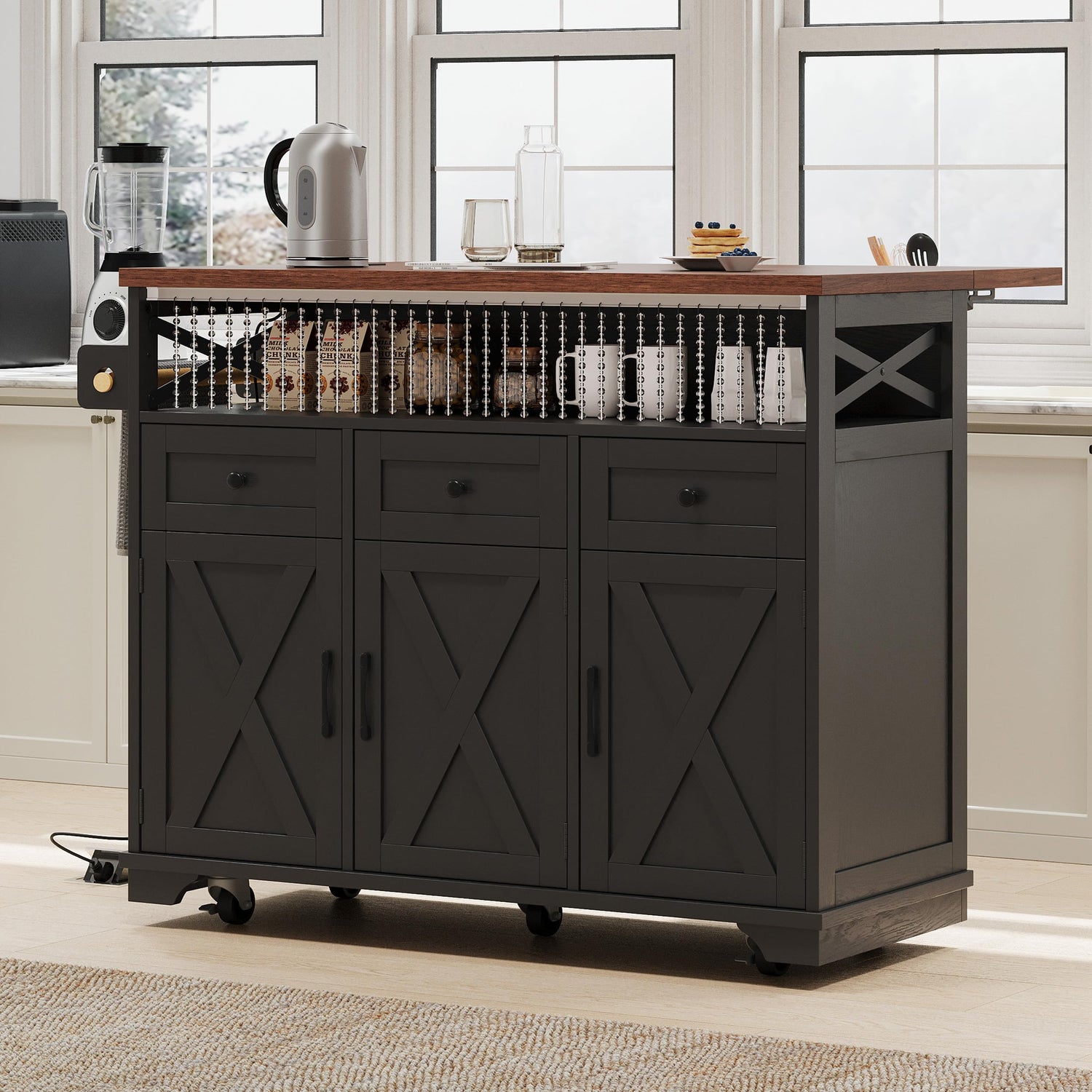 XD Designs 46.5'' Farmhouse Kitchen Island with Power Outlet and Drop Leaf, Wood Rolling Kitchen Cart on Wheels with 3 Doors, 3 Drawers, Drape of Beads and Internal Iron Shelf (Black-3.19)