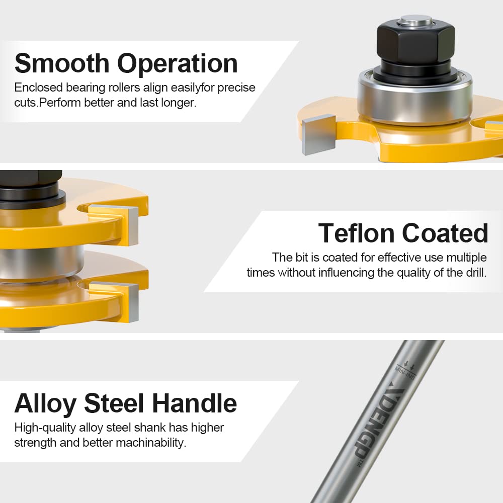 - Safety: XDENGP's Tongue and Groove Router Bit Set with anti-kickback design provide higher stability and less vibration. When using, it should be noted that at least clamp to the "min insert" line,and the RPM ≤ 16000. Pushing slowly can help you get a smoother and cleaner cut