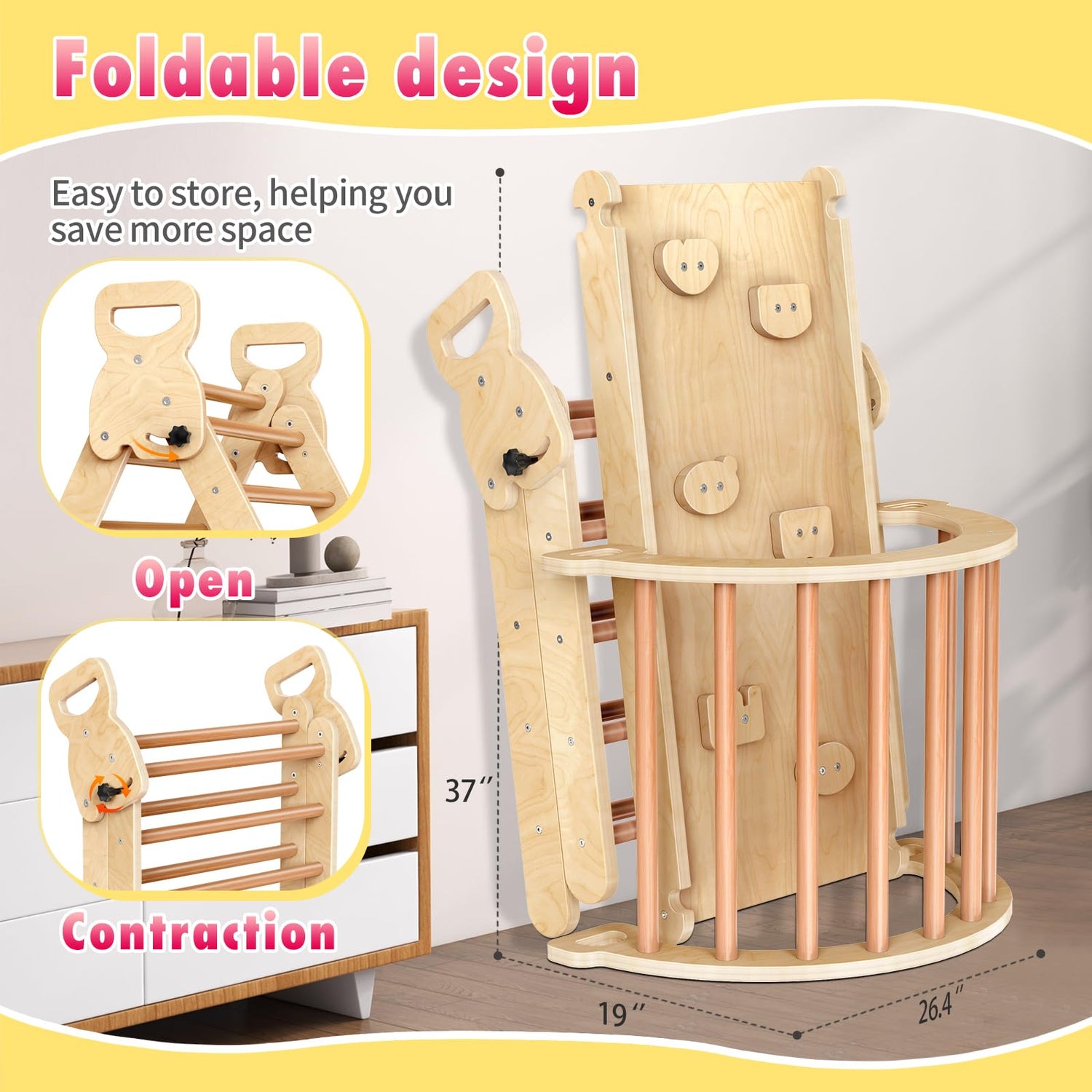 - Easy To Assemble And Foldable: Each hole of our pikler triangle set has slots to fix the round rods without turning too much. We provide detailed instructions and videos to make assembly a breeze. The indoor toddler climbing toys have two knobs on the top for easy folding. You can store freely in each corner