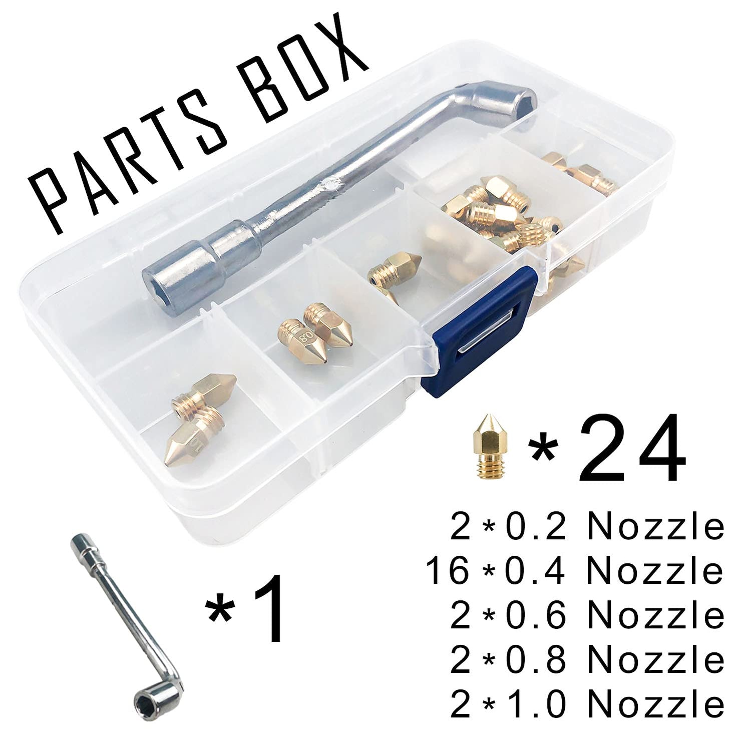 XIFOWE MK8 Nozzles 24 pcs 3D Printer Extruders Brass Nozzles 0.2mm, 0.4mm,0.6mm, 0.8mm, 1.0mm CR-10 Nozzle with DIY Tools and Metal Storage Box for CR-8 / CR-10 / Ender 3 / Ender 3S / 5/6 and so on…