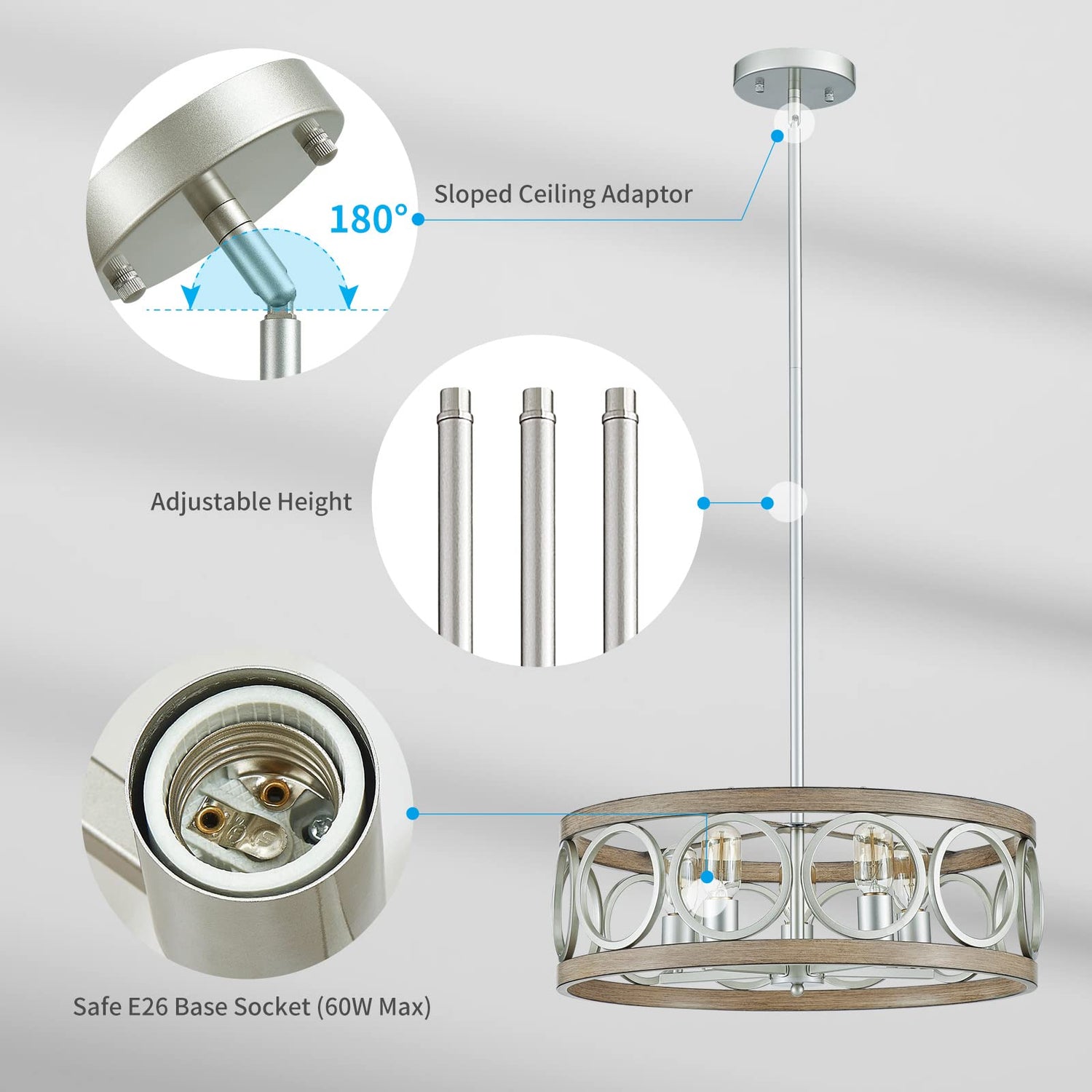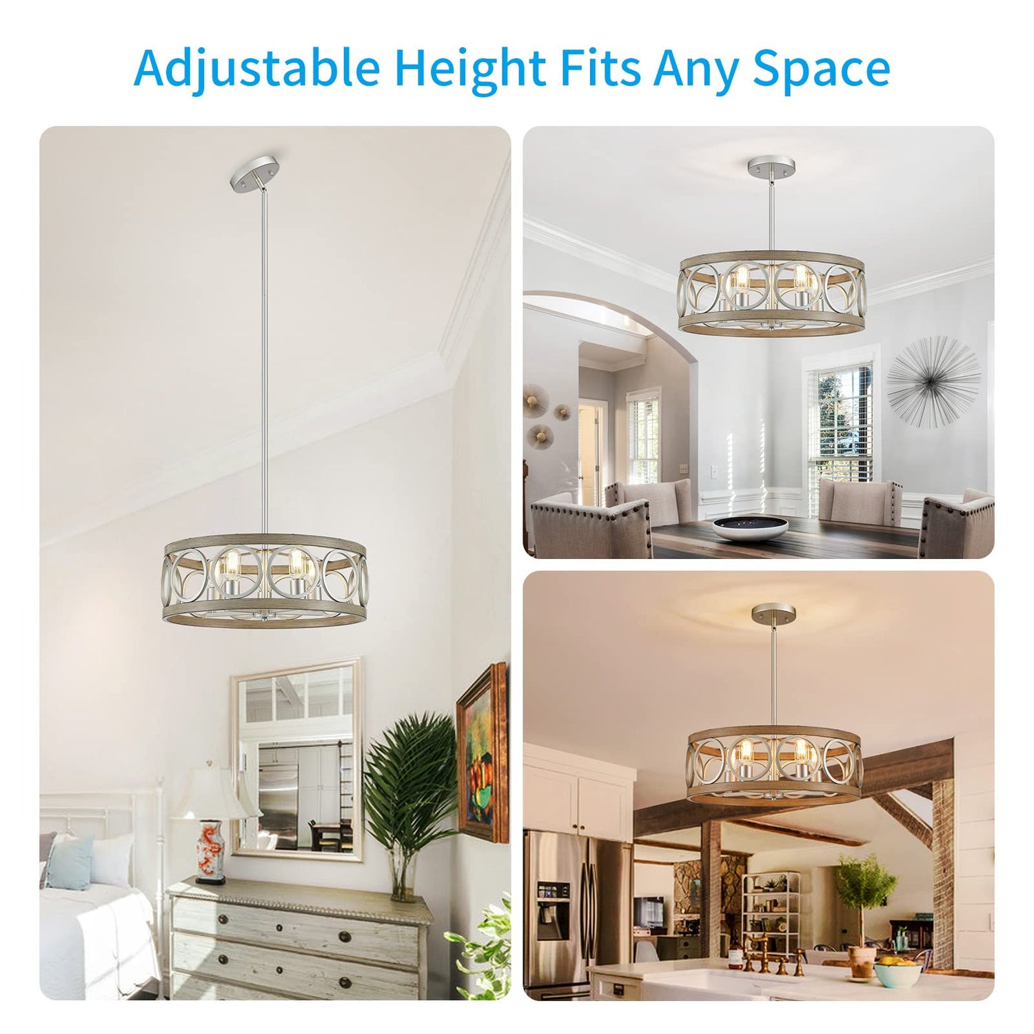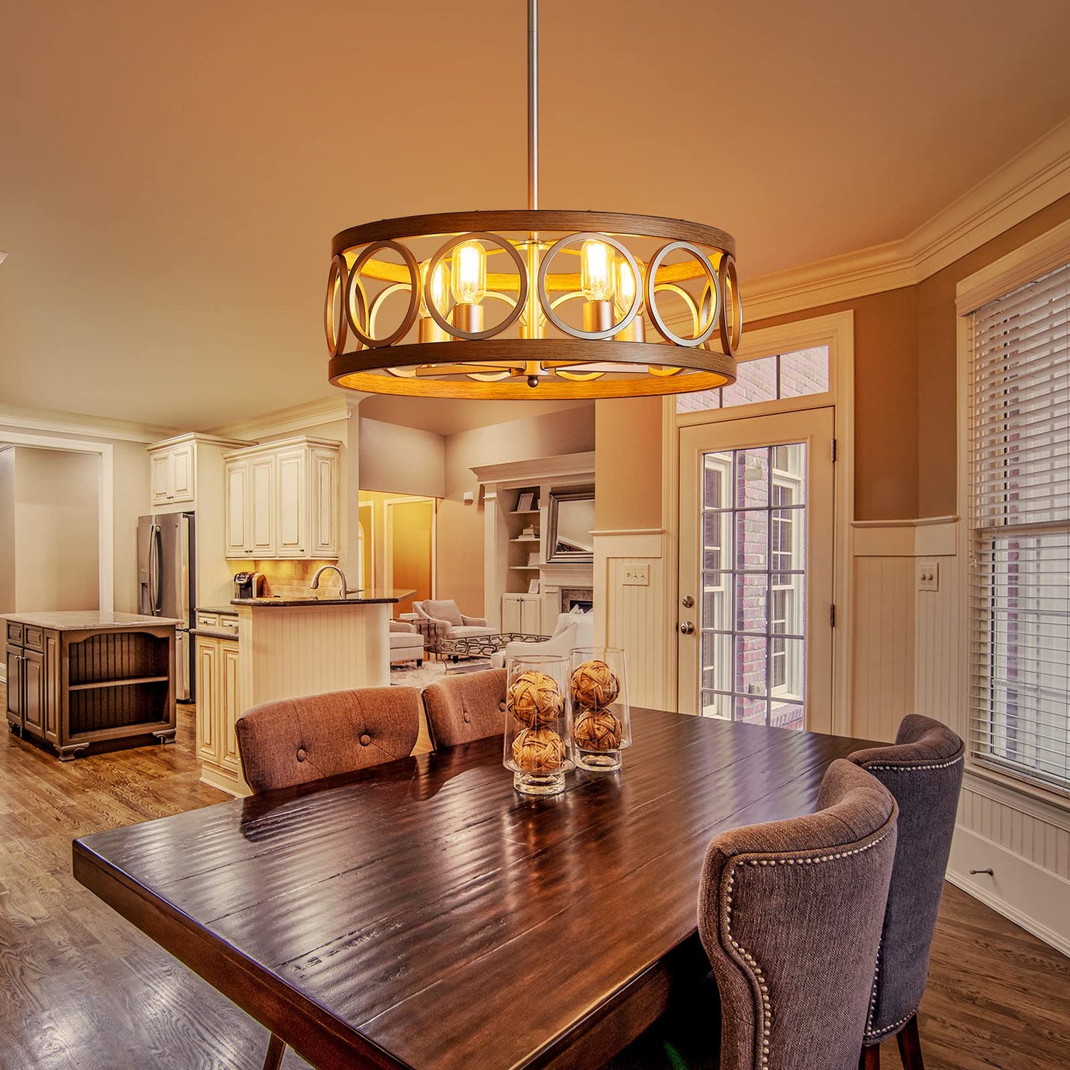 - [Perfectly Versatile] This farmhouse chandelier features a unique open drum frame with an antique wood grain and brushed nickel finish, made of durable metal, not plastic. Its versatile design complements various decorative styles, from modern to farmhouse, and adds brightness to your home kitchen, dining room, or farmhouse-style place.