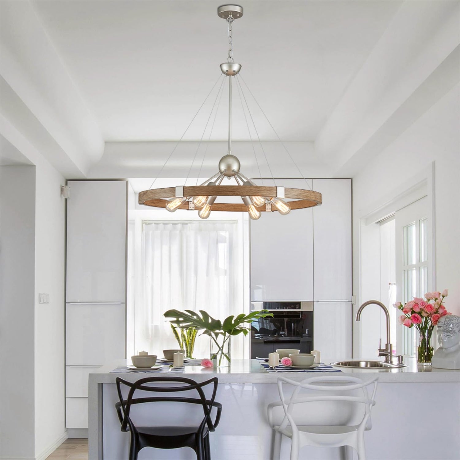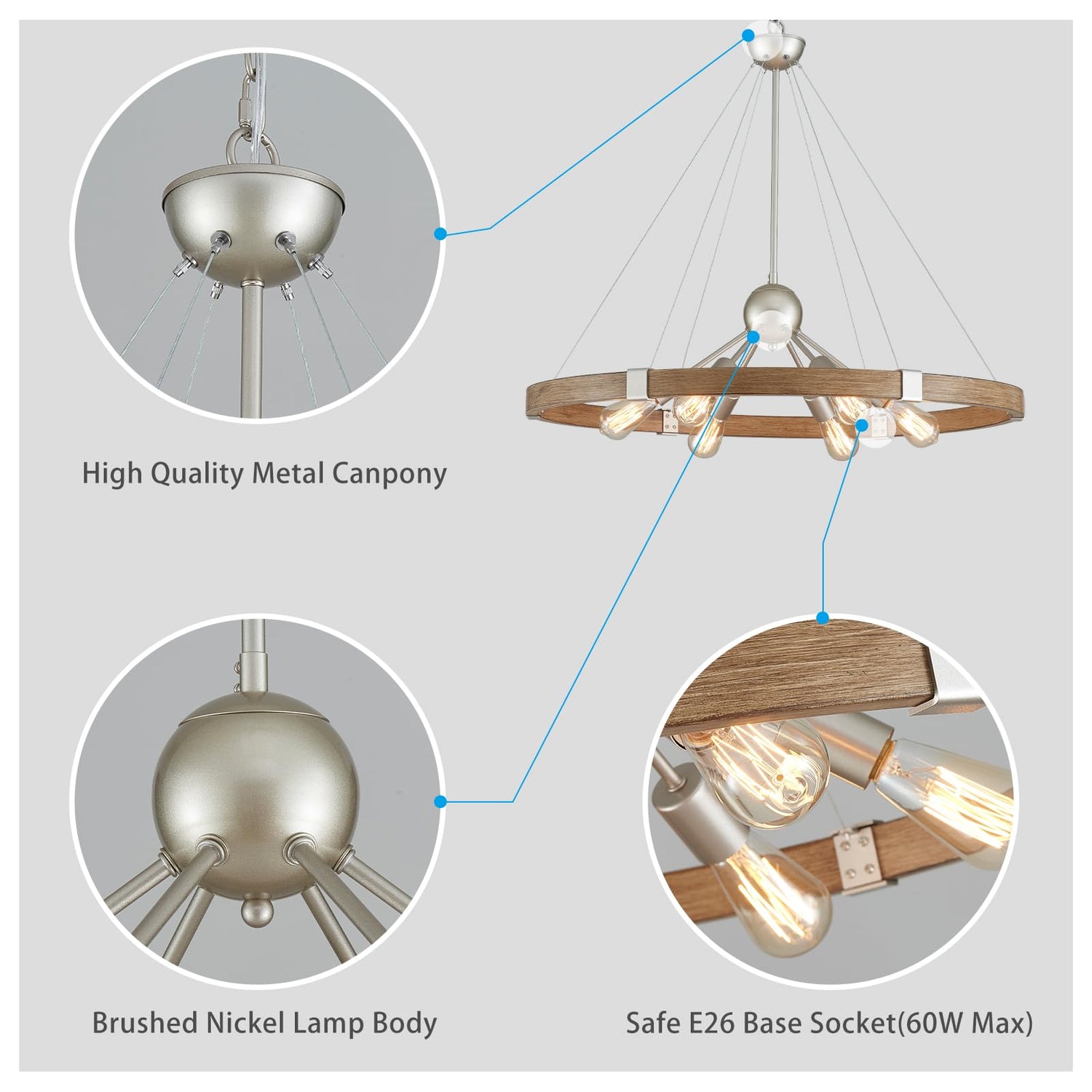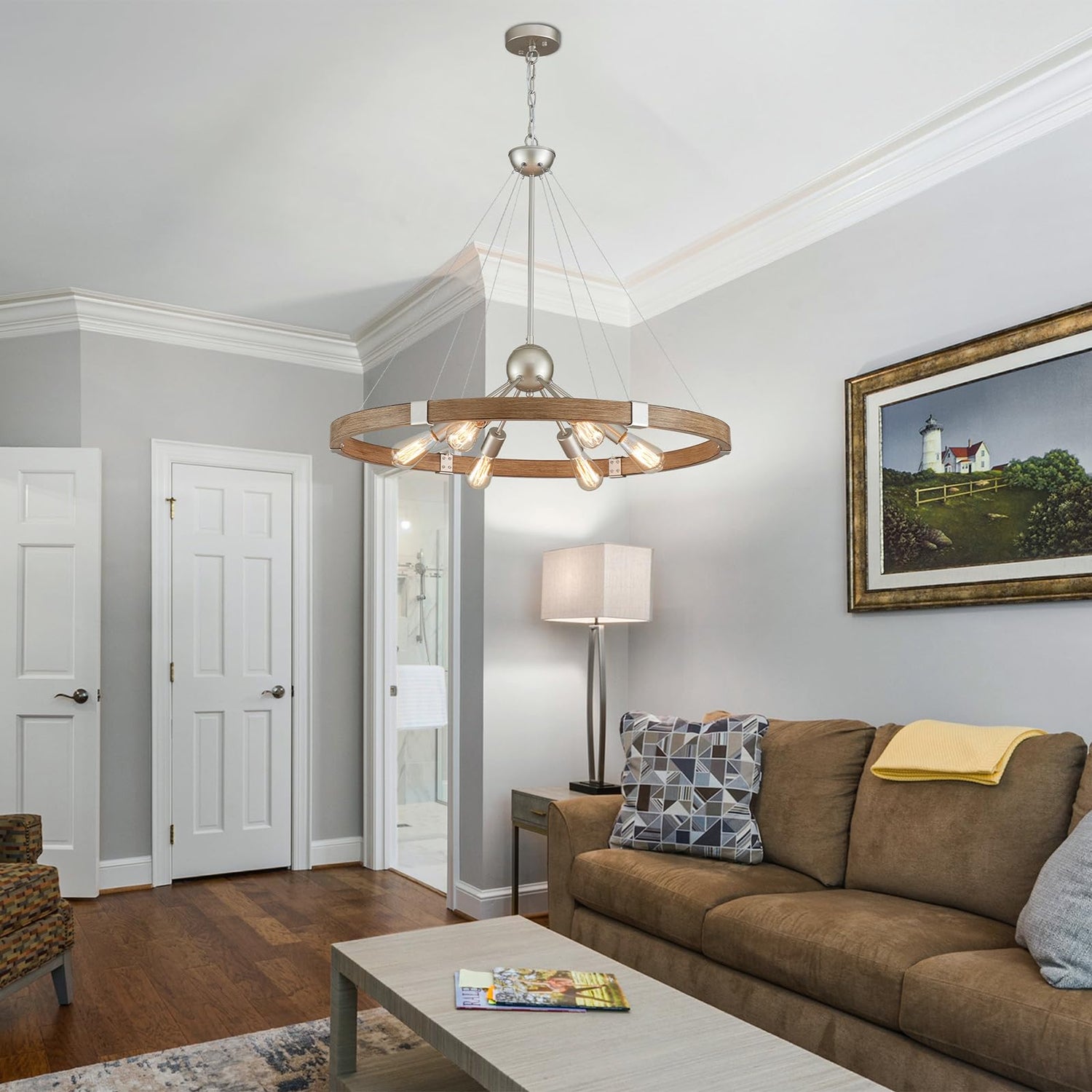 - MODERN CHANDELIER: The wood grain finish office wagon wheel chandelier features a sleek, round design that complements any decor style, from vintage to modern. With its clean lines and rustic charm, this chandelier adds a touch of elegance to any space.