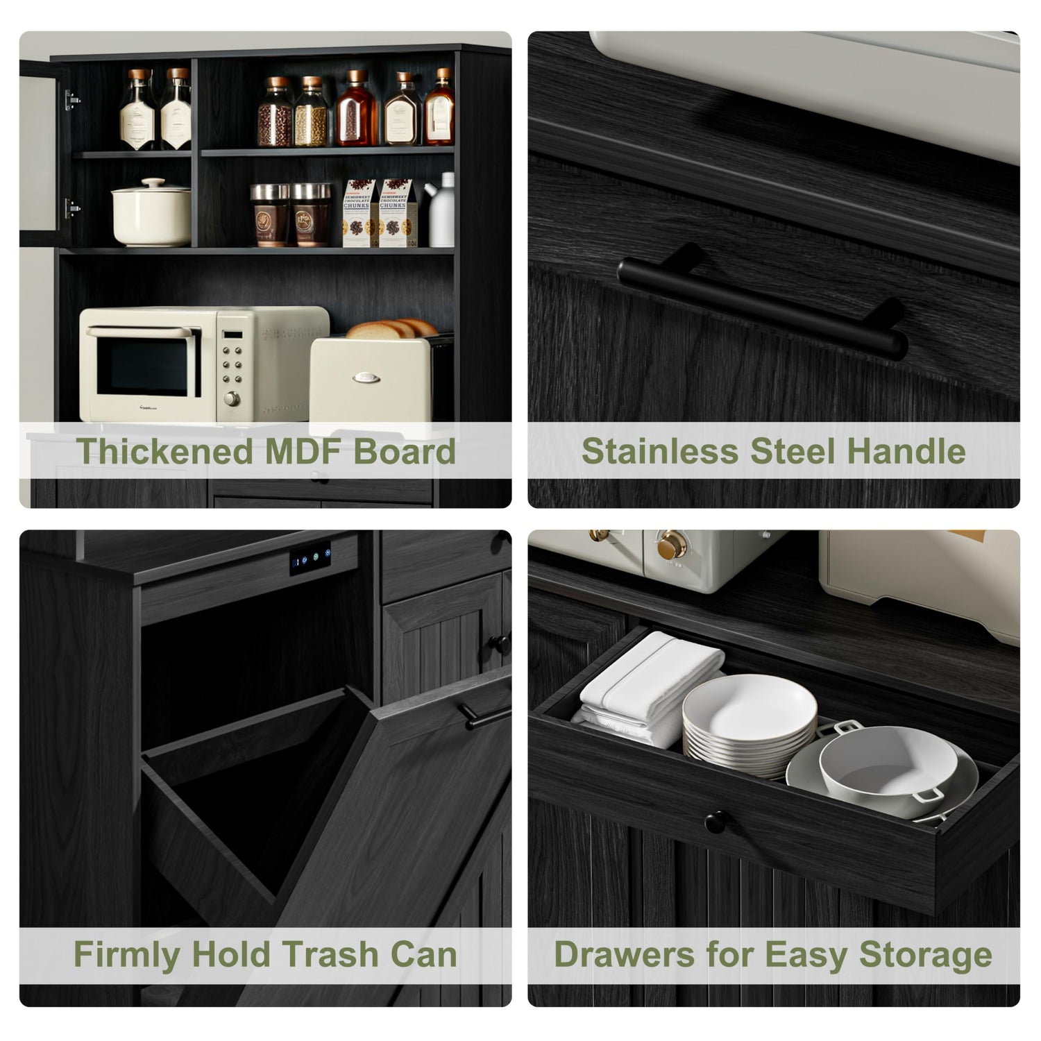 - 【Kitchen Pantry Cabinet with Ample Storage Space】This kitchen storage tilting cabinet features a bottom shelf with a trash cabinet that holds a 10-gallon bin and two levels of storage with cabinet doors; a middle countertop that can hold a microwave or coffee maker, and a top shelf with glass cabinet doors and open two levels of storage, an abundance of storage space to meet the storage needs of any home.