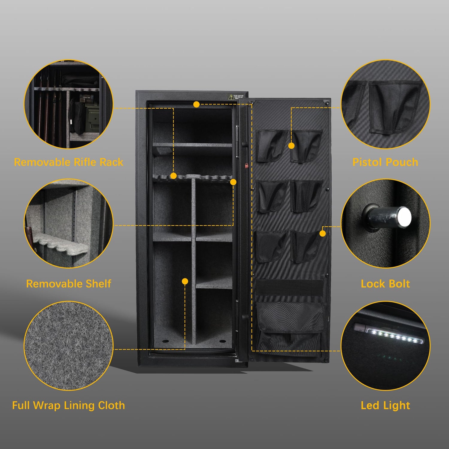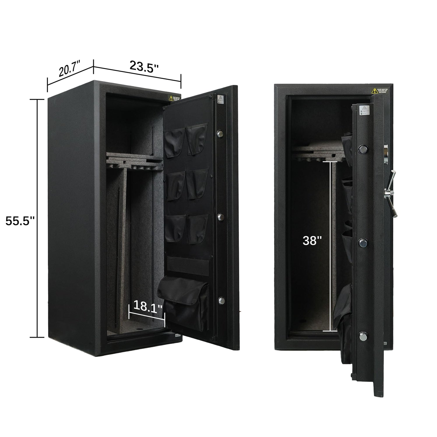 - 【Spacious & Adjustable Interior】 – 55.5" x 23.5" x 20.7" (1410x597x527mm) large capacity holds 24 rifles + 6 pistols + ammo. Adjustable shelves fit guns of all lengths, with or without scopes, for flexible storage