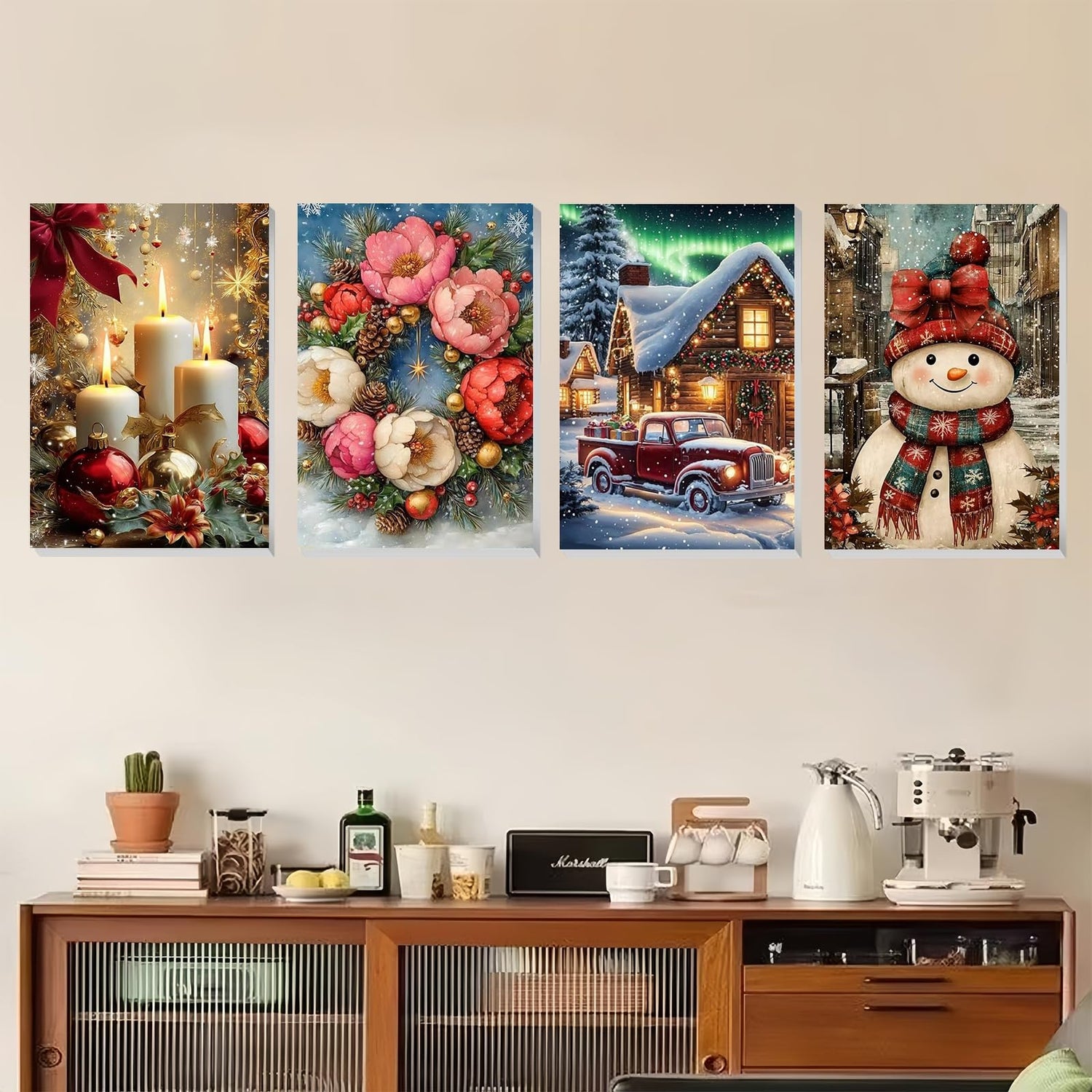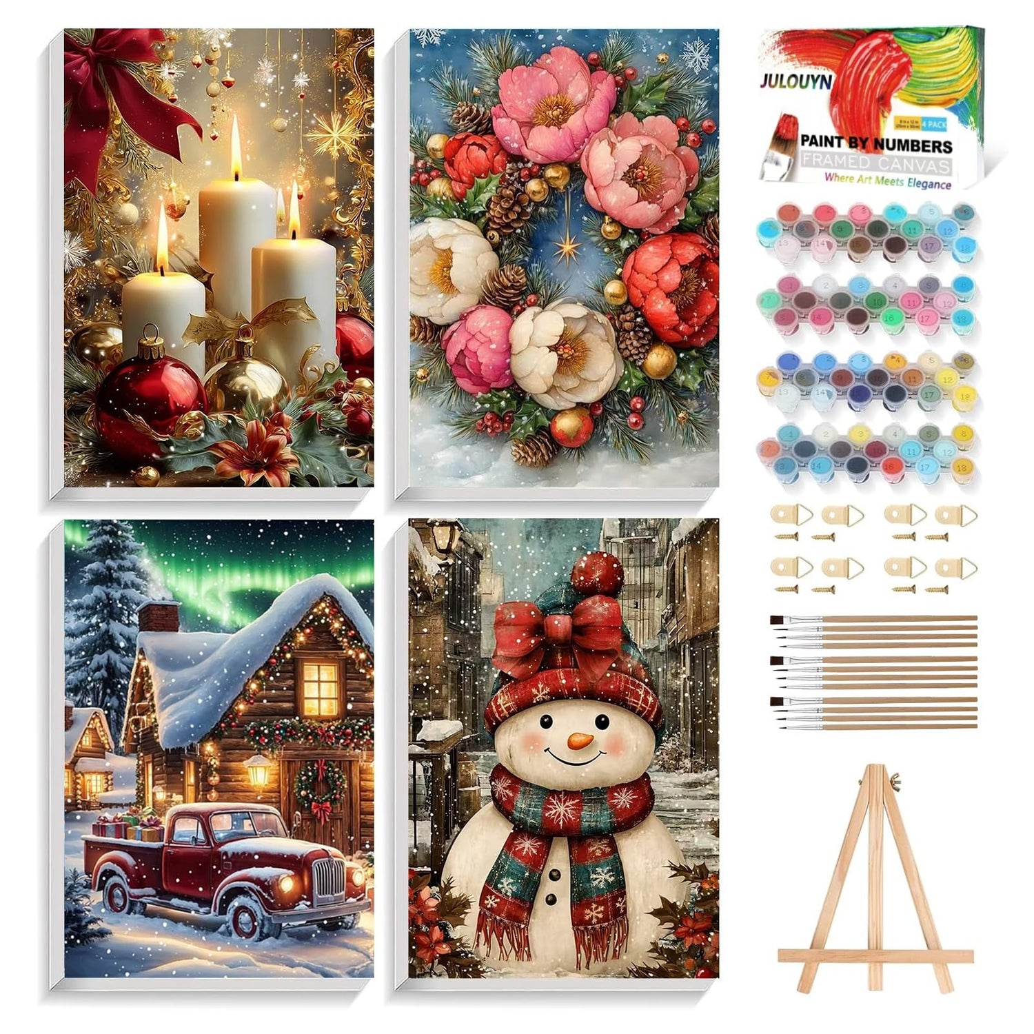 XTCIXAL 4 Pack Paint by Numbers Kit for Adults with Framed and Easel, Christmas Paint by Number Kits, Candles Snowman Truck Wreath Acrylic Oil Painting for Home Wall Decor (8x12 Inch)