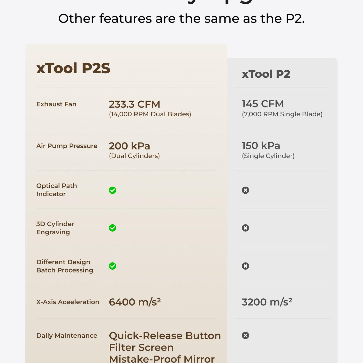 - Enhanced Performance: The xTool P2S provides stronger airflow with more powerful exhaust fans and a dual-cylinder air pump, delivering sharper, cleaner cuts and engravings. It offers optical path indicators, and easier daily maintenance. With upgraded hardware and software, making the best desktop CO2 laser cutter become better.