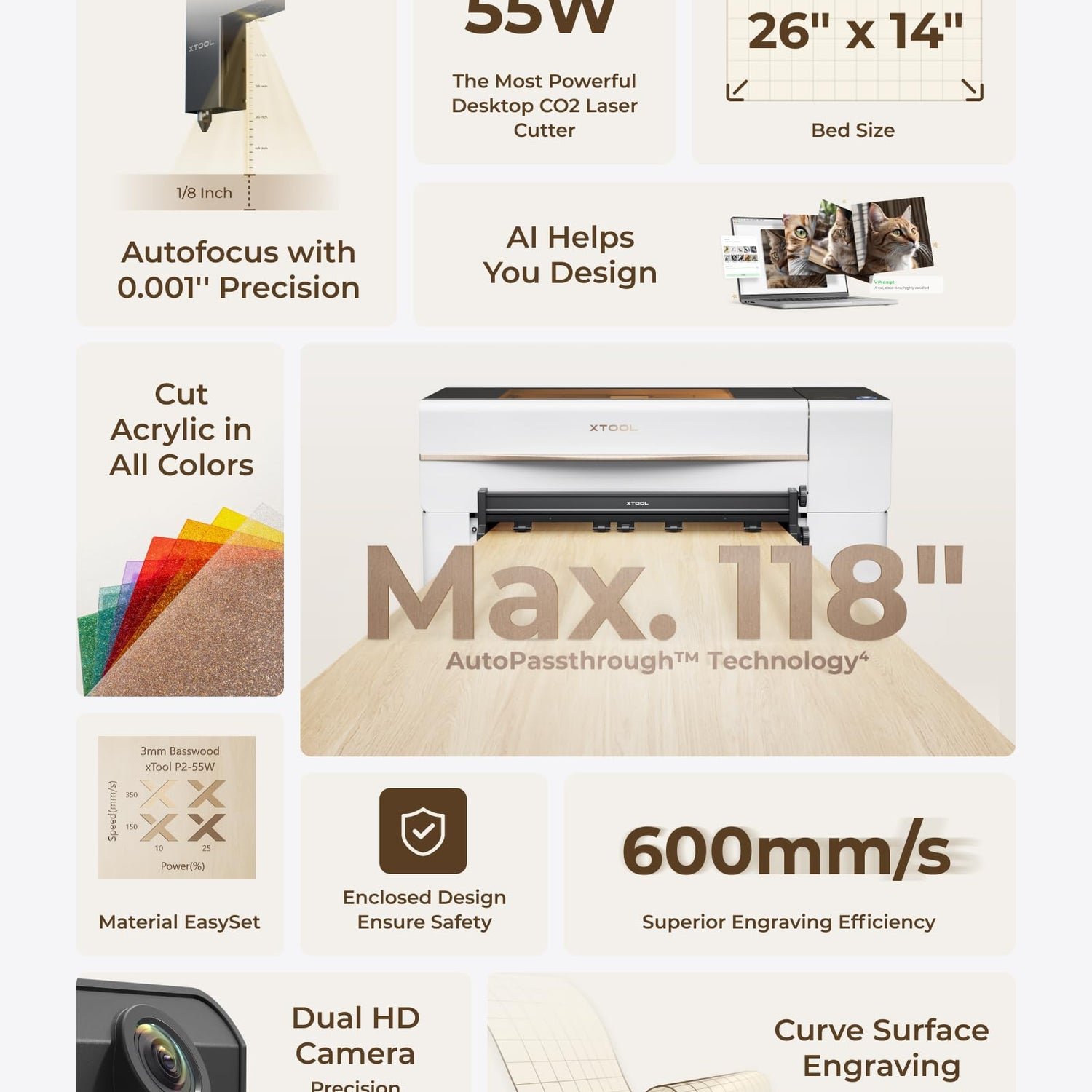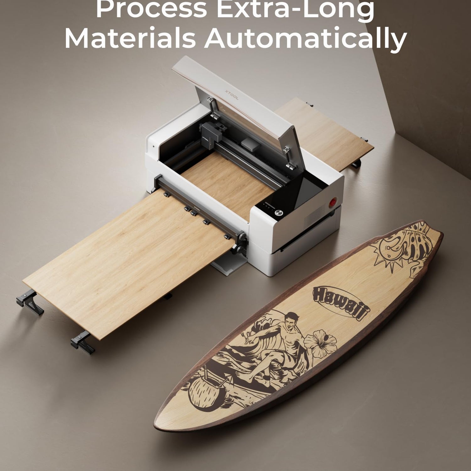 - Expandable Working Area: xTool P2S features a large 26" x 14" bed, Auto-Passthrough for materials up to 118” long, and a Riser Base for engraving objects up to 8.4” high, offering flexibility for long, wide, or tall projects. Its 3D Curve Engraving automatically creates accurate 3D models, enabling flawless results on curved cylinder objects. Compatible with the RA2 Pro Rotary, it’s perfect for engraving tumblers, mugs, and rings, expanding your creative possibilities.