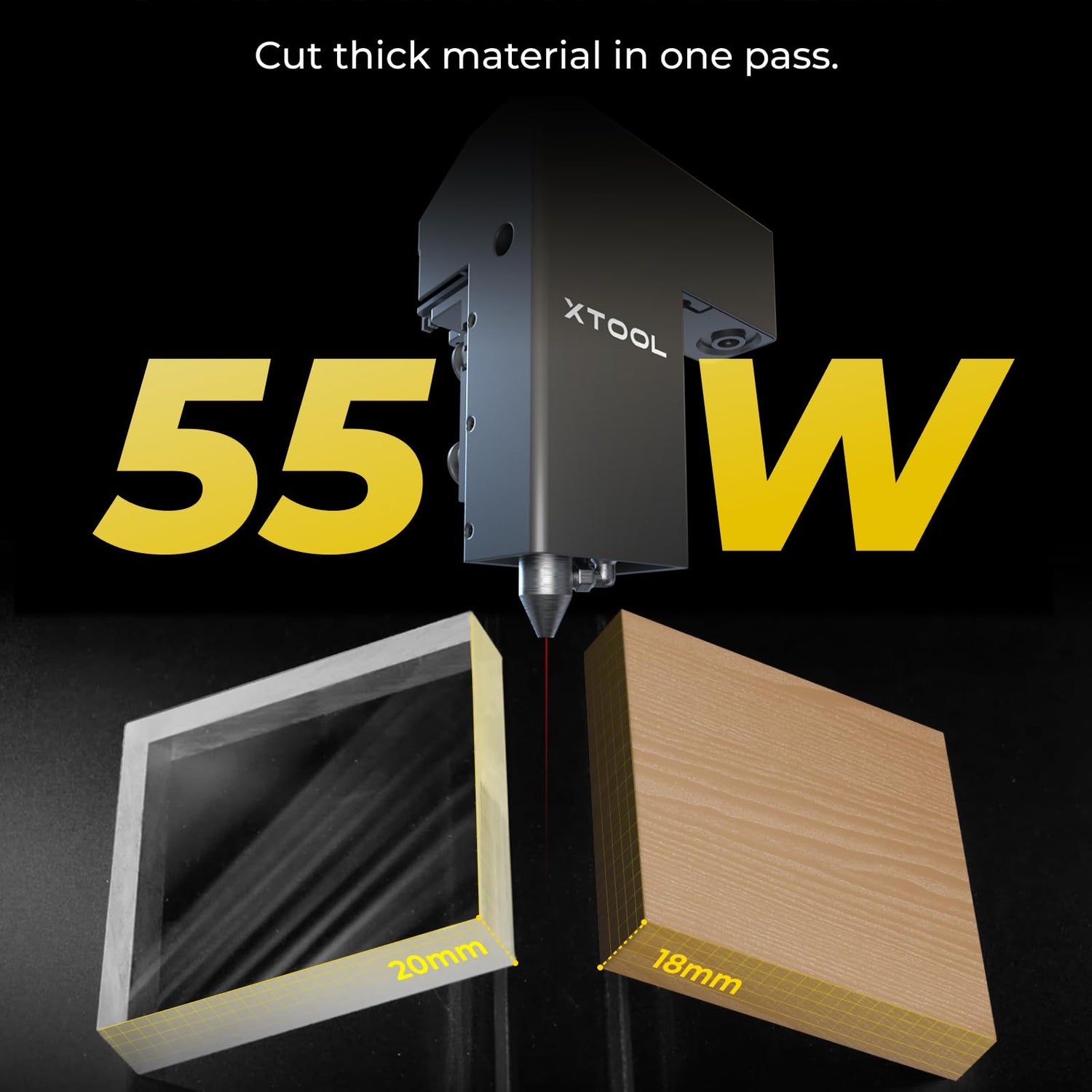 - Effortless Cutting & Precise Engraving: With industry-leading 55W output and a custom CO2 laser tube, the xTool P2S cuts through all colors of acrylic up to 20mm thick and black walnut up to 18mm in a single pass. It’s also perfect for precise engravings on glass, ceramic, slate, coated metals, anodized aluminum and more, thanks to its high absorption efficiency.