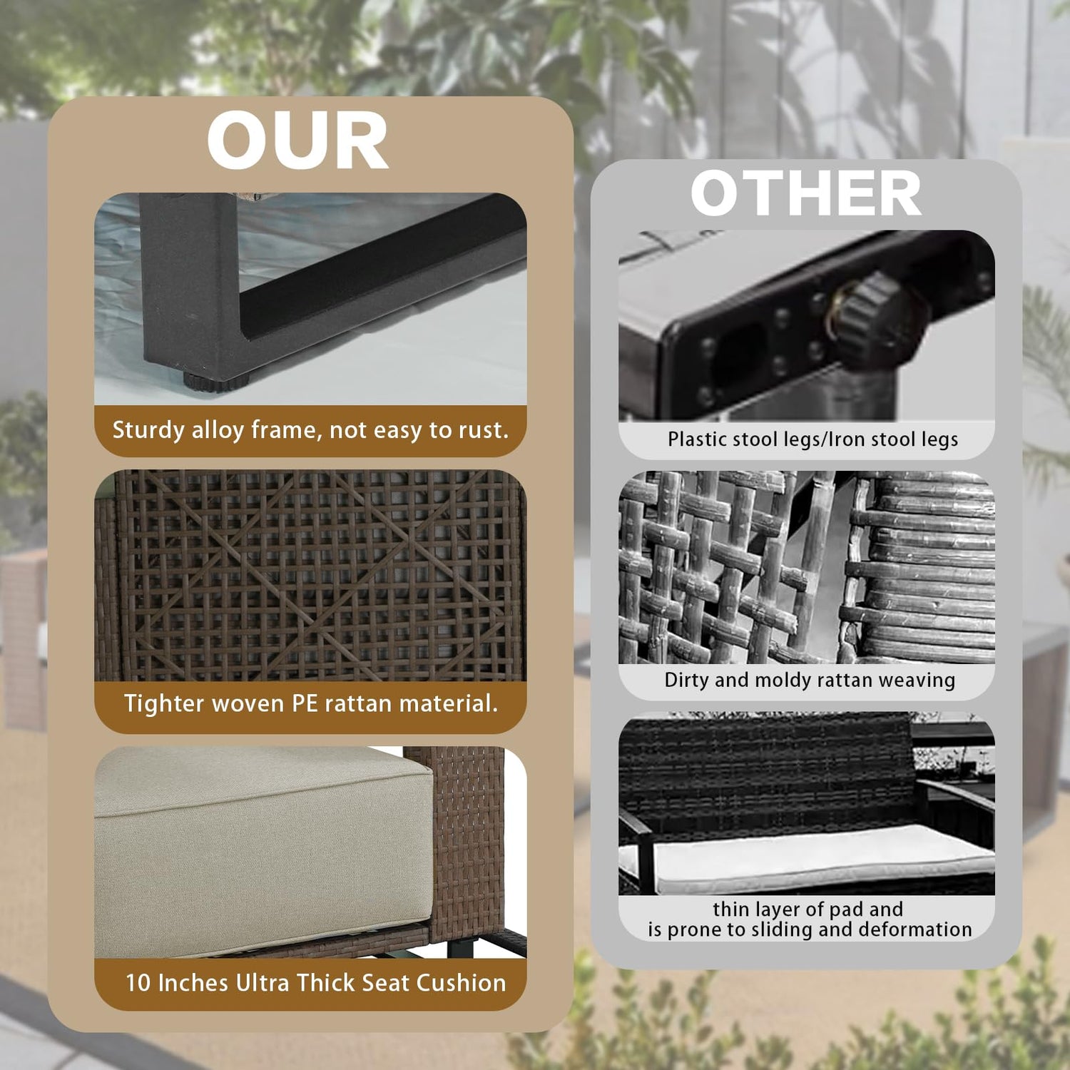 - 【All weather materials】This rattan imitation wood terrace furniture set is made of all-weather resin open basket patterned willow, easy to clean, extremely resistant to sunlight, rain, high temperature and cold, and will not crack, sag or fade. Willow branches are hand woven on powder coated steel frames, which can withstand outdoor factors and provide excellent durability and toughness.