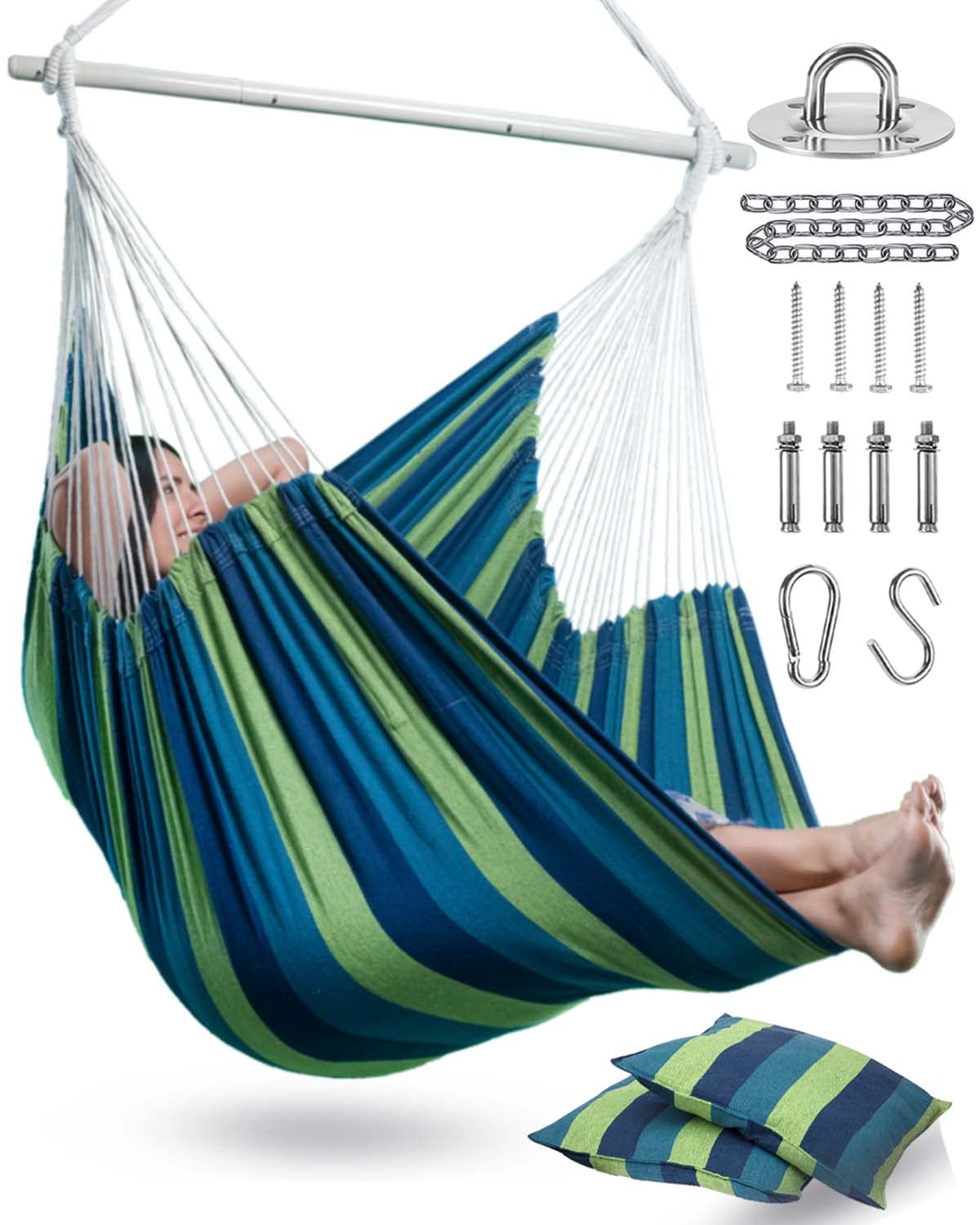 - Super Comfort&2 Cushions: XXL larger size hammock chair comes with 2 pillows to hold your back and your head which can let you feel more soft and comfortable.When you come back from office can take a nap with your kids or pets randomly.