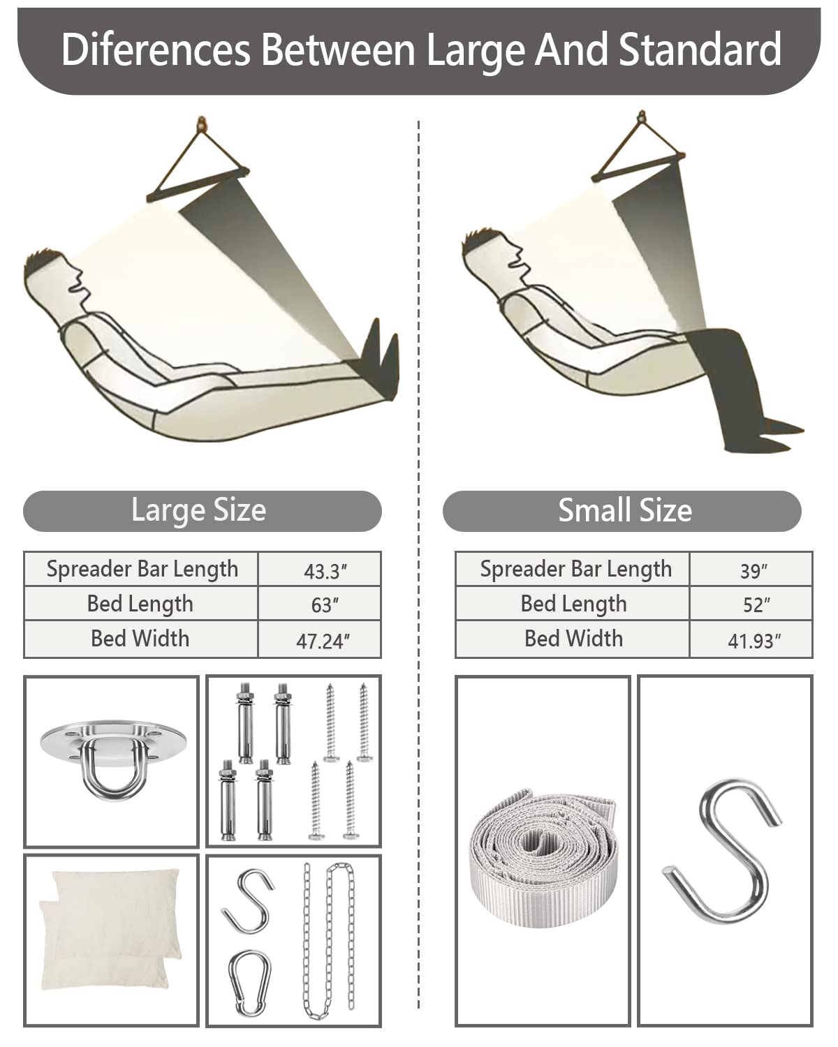 - Extra Larger Size&500lbs: Extra larger size hammock chair swing and 500lbs capacity allow adults or 2 people to lay back and relax completely.Compare to the normal size hammock chair ,extra large size can provides you maximum relaxation.