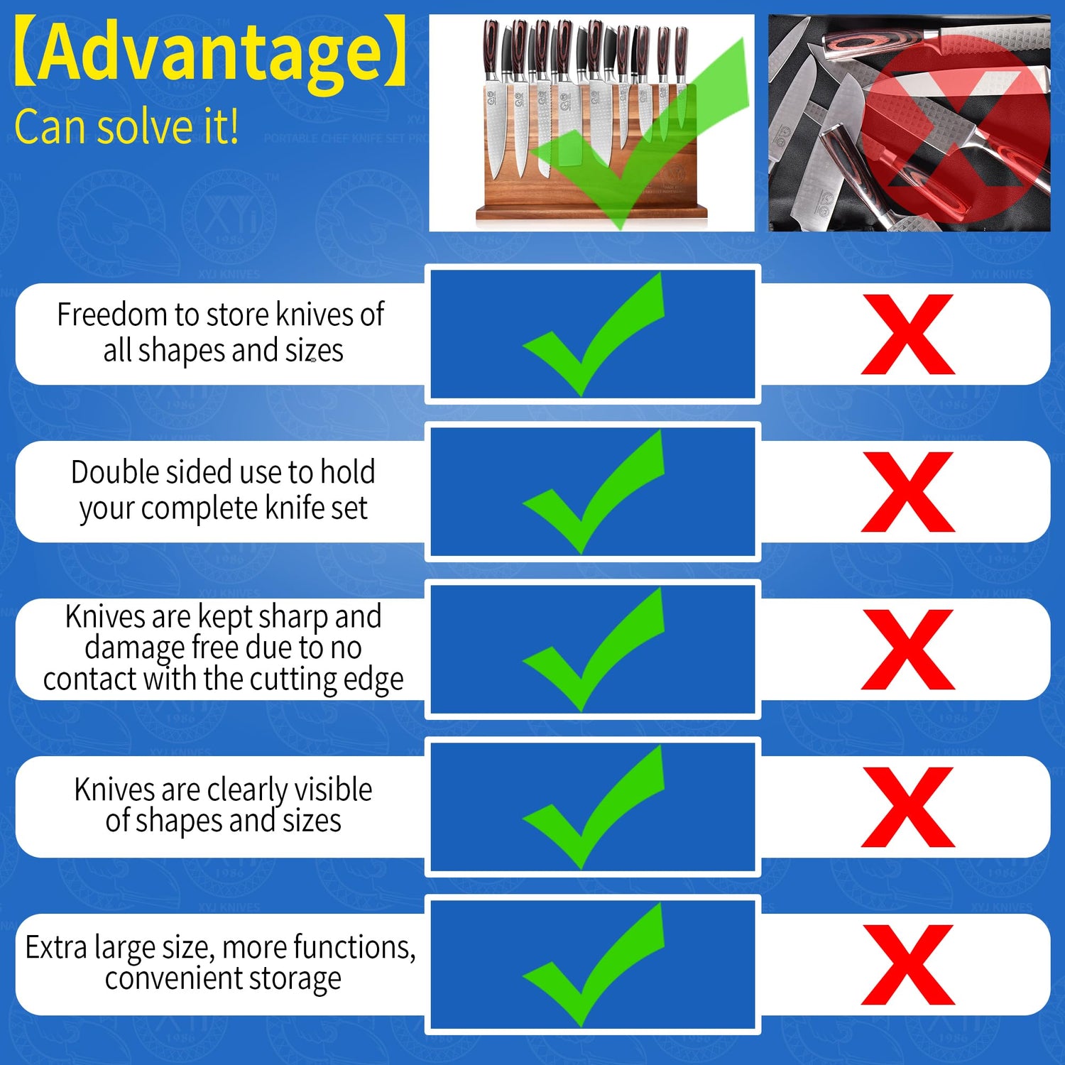 - High Quality - This magnetic knife holder is made from natural wooden material manufacturing, sturdy, durable and environmental protection, create a green and healthy kitchen for your house. Our universal knives block can store all kinds of stainless steel kitchen chef knife.