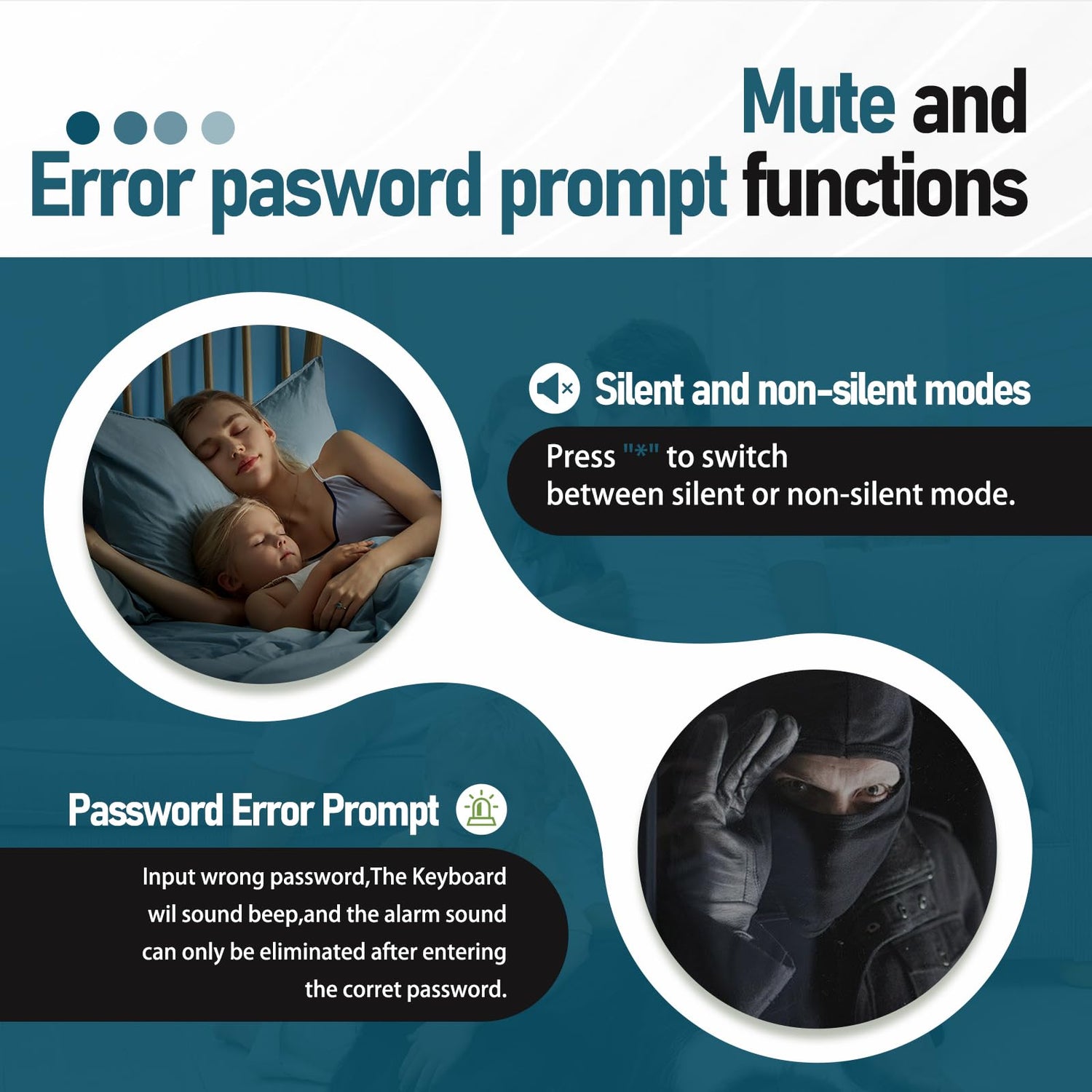 - 【Gun Safe Details】Removable Gun Rack: You can adjust the height of the gun rack according to the length of the gun. Silent Mode: Press "*" to switch between silent and non-silent modes.LED Light:When you enter the gun safe by password, the LED light will light up, providing light at night.