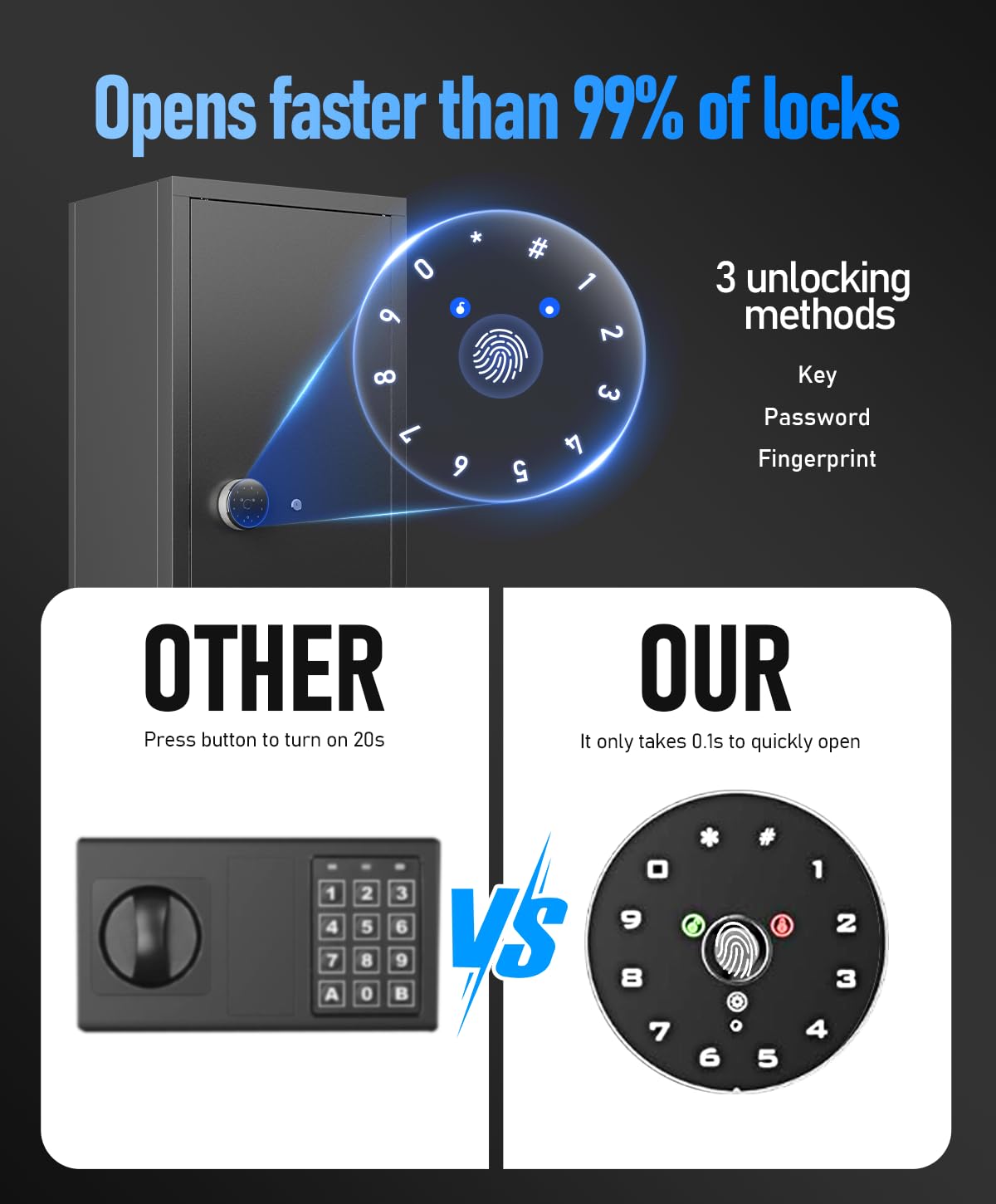 - Customizable Security Options : Toggle between mute and alarm modes; alarm activates after five incorrect attempts; LED light illuminates inside for easy firearm retrieval.