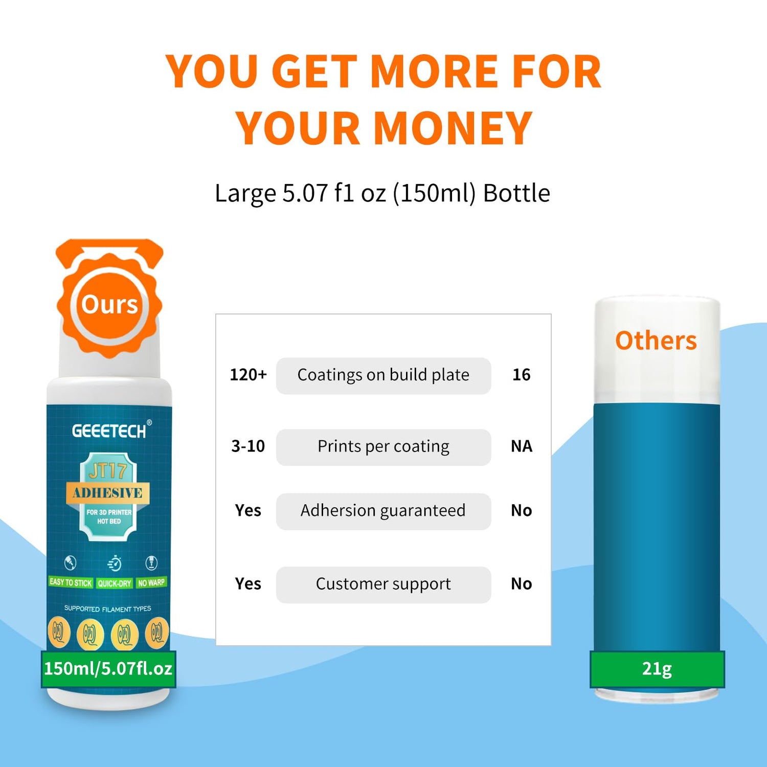 - 【Long Lasting】150ml/5.07fl oz large volume 3D print adhesive allows more than 120 coatings on the build plate, print 3-10 times on a single coating, which means at least 1200 prints with perfect first layer are guaranteed with just a single purchase!