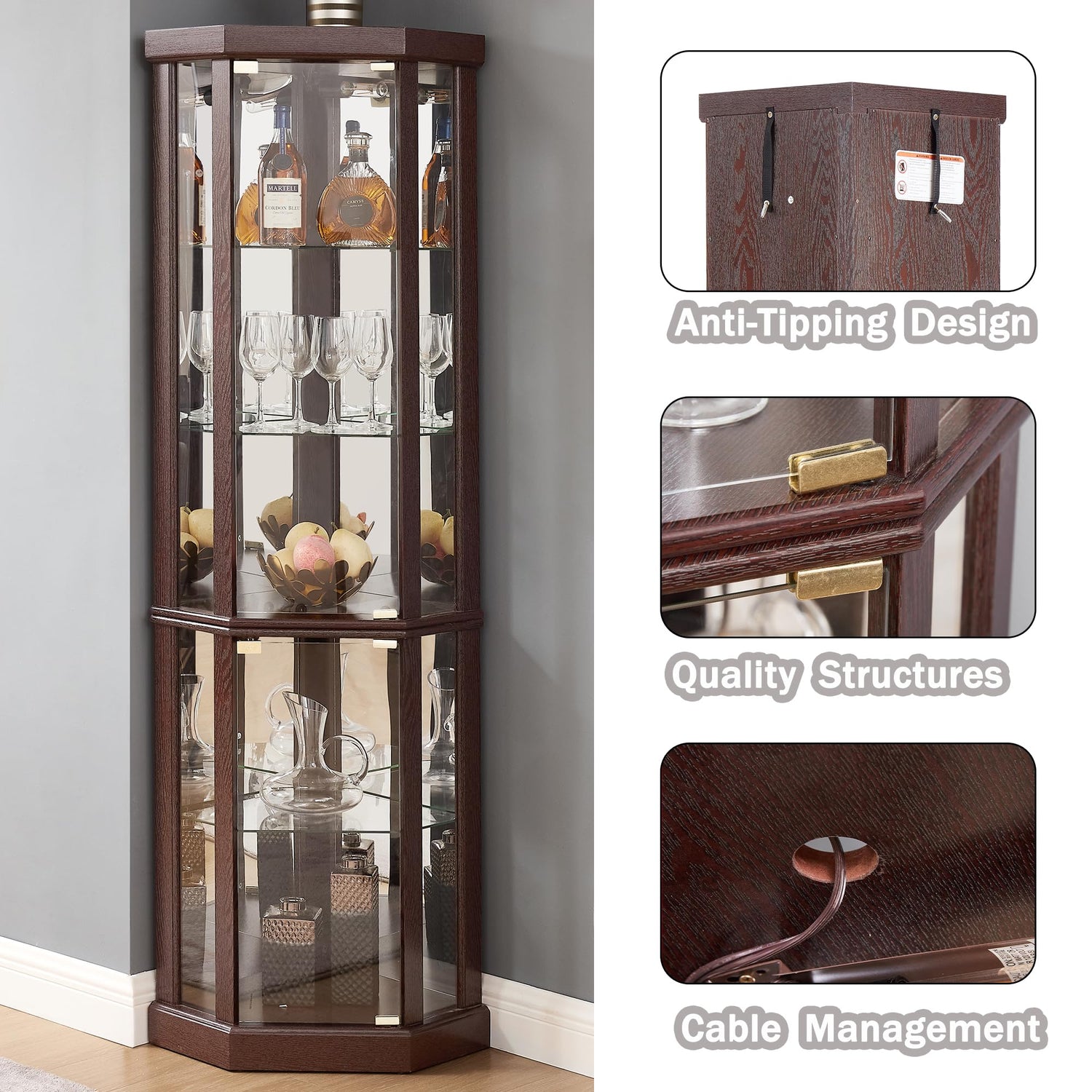 - 【Sturdy & Durable】The corner glass display curio cabinet is made of high quality wood. The glass shelves can hold up to 150 lbs. overall and up to 25 lbs. per shelf for most item storage needs. The wood-framed tempered glass ensures a safe, dust-free and durable interior. Anti-tip mechanism ensures the stability of the glass display case for your safety