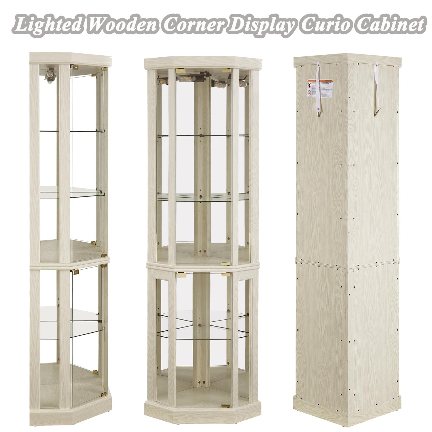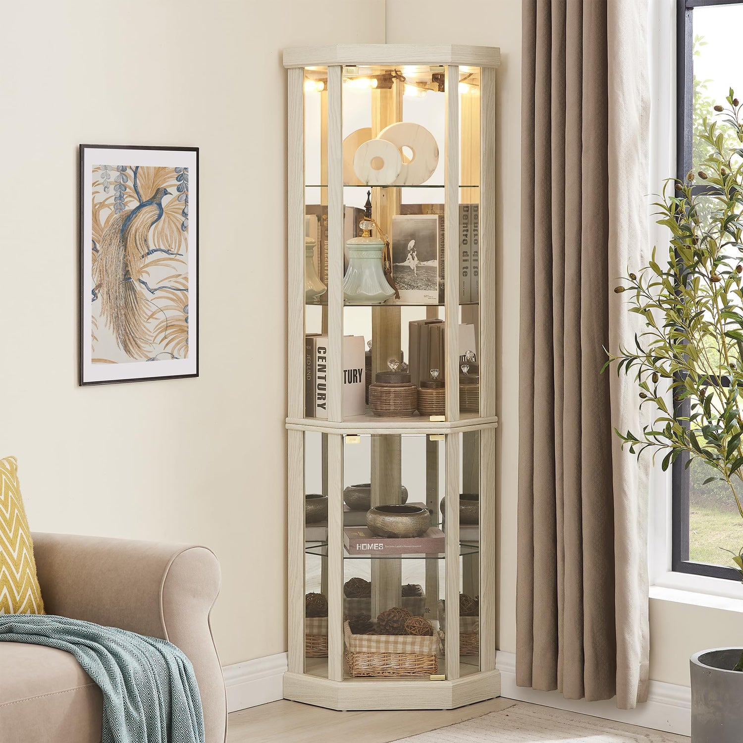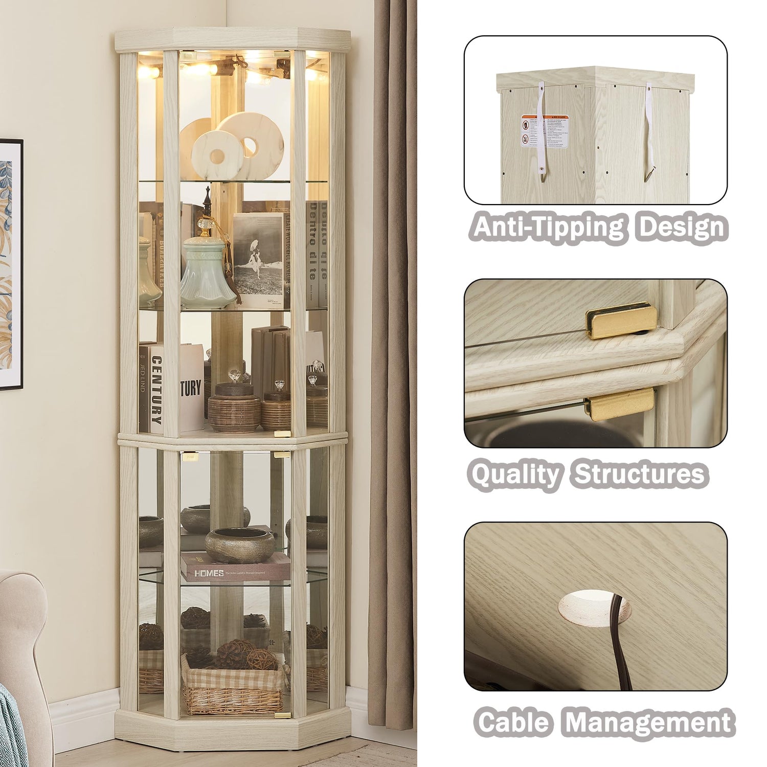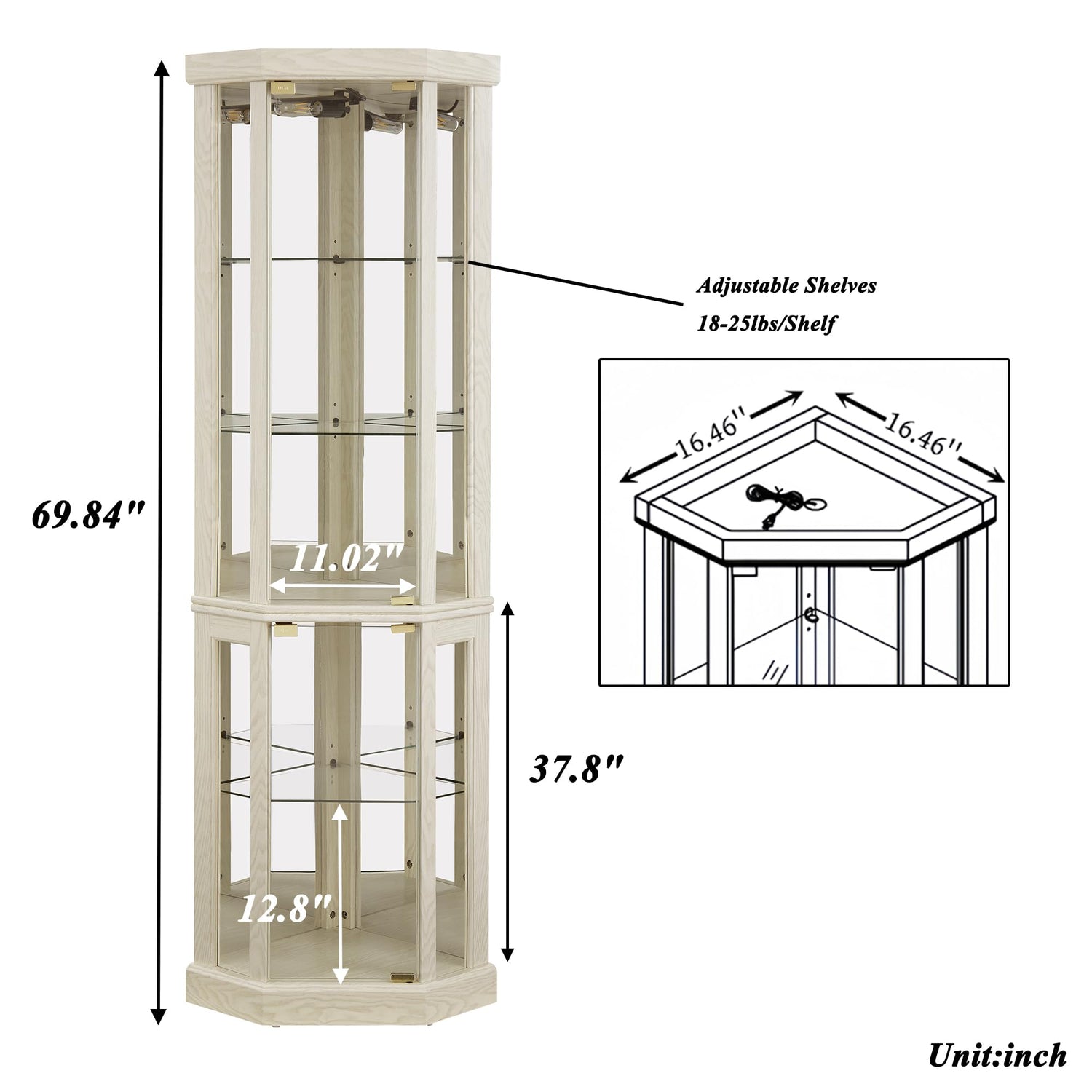 XZTUAJ 69"H Lighted Curio Cabinet Corner Display Case, Corner Glass Cabinet with Adjustable Shelves and Tempered Glass, Wooden Corner Curio Cabinet w/ Mirrored Back Pane for Living Room(Antique White)
