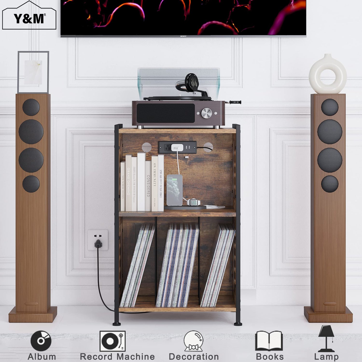 - đ”ăPower Outlets & USB Charging PortsăRecord player stand is designed with a socket of 2 USB ports and 2 standard plug sockets on the back of the second-floor space for your record player, turntable, receiver, speaker, phone, headset, and tablet with fast charging flexibly at the same time, which provides great convenience to your life when you are using them.