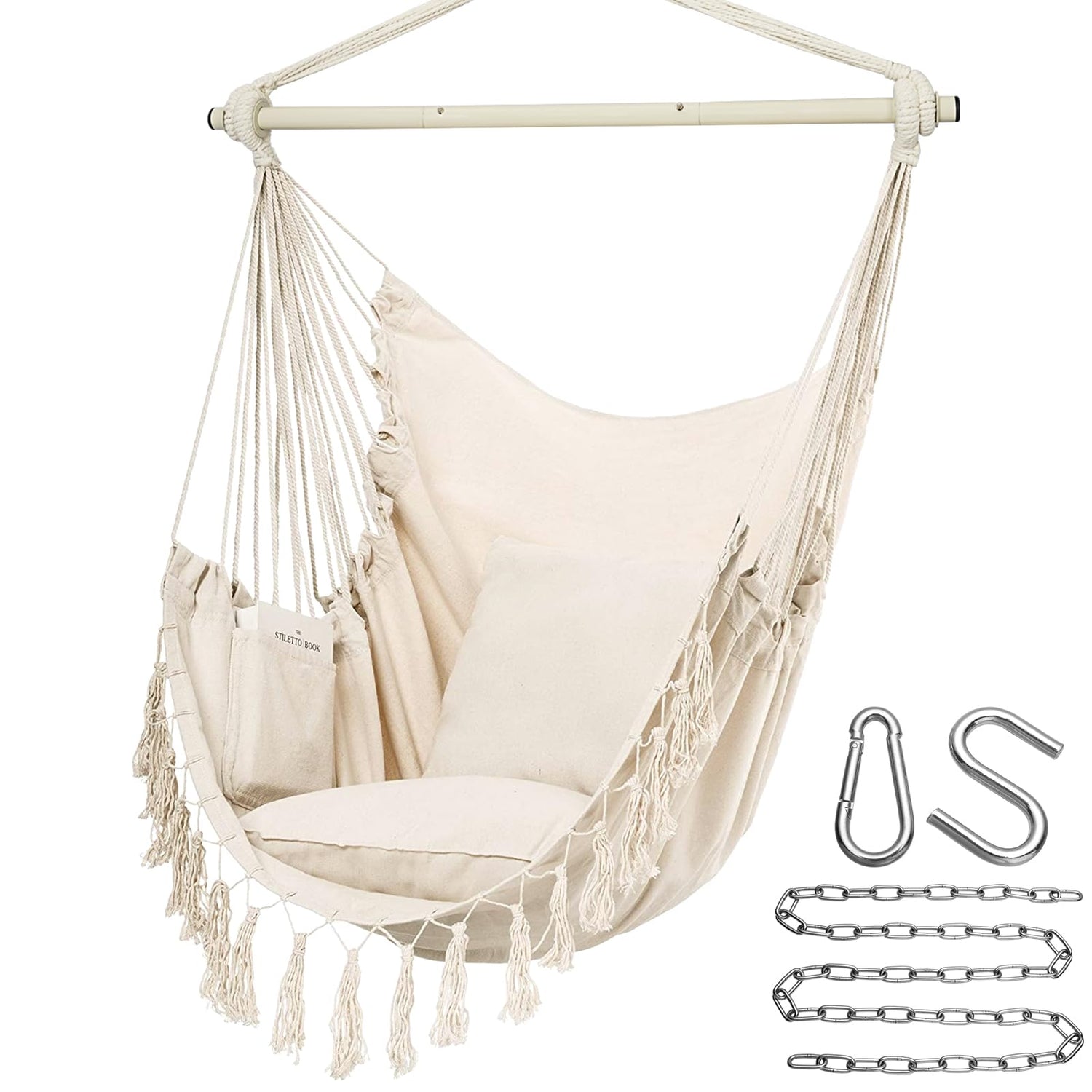 Y- Stop Hammock Chair Hanging Rope Swing, Max 500 Lbs, 2 Cushions Included, Large Macrame Hanging Chair with Pocket for Superior Comfort, with Hardware Kit (Beige)