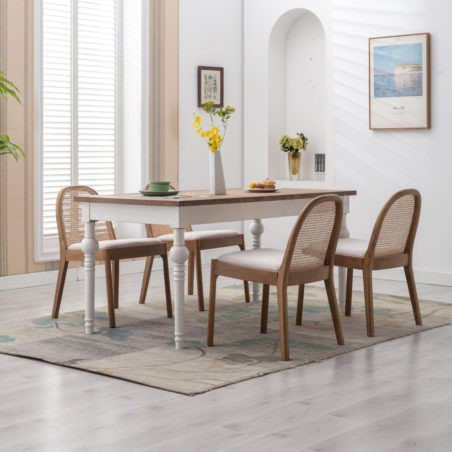 - Mid Century Style: Arched rattan backrest add mid century country style to your home, create relaxed elegance for any space. The square padded seat cushion is linen or sherpa upholstered, adding modern appeal to your kitchen.