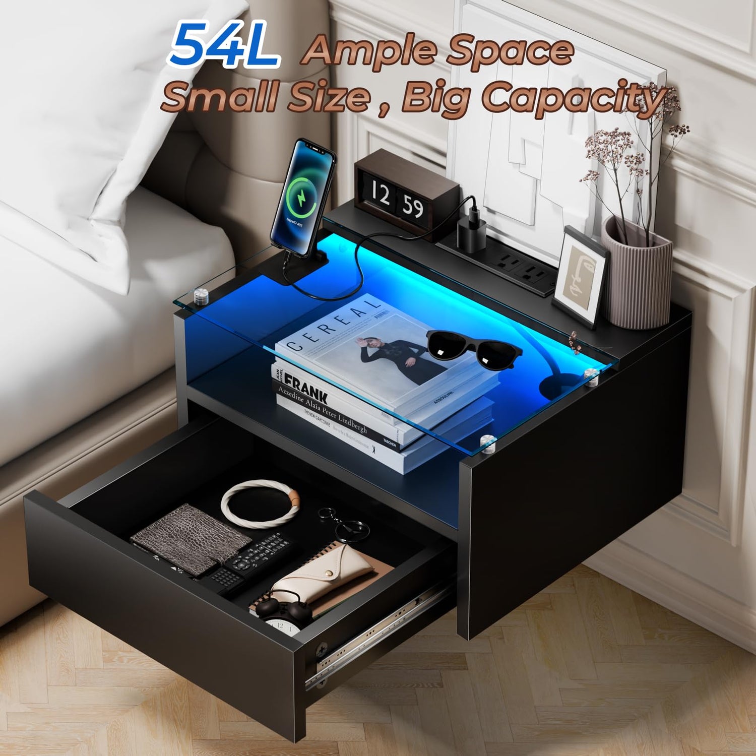 - 【 LED Ambient Lighting & Glass Tabletop】The floating nightstand with LED ligting, LED lights are refracted through the glass, making the light softer and more romantic. It makes the whole bedroom look very advanced.