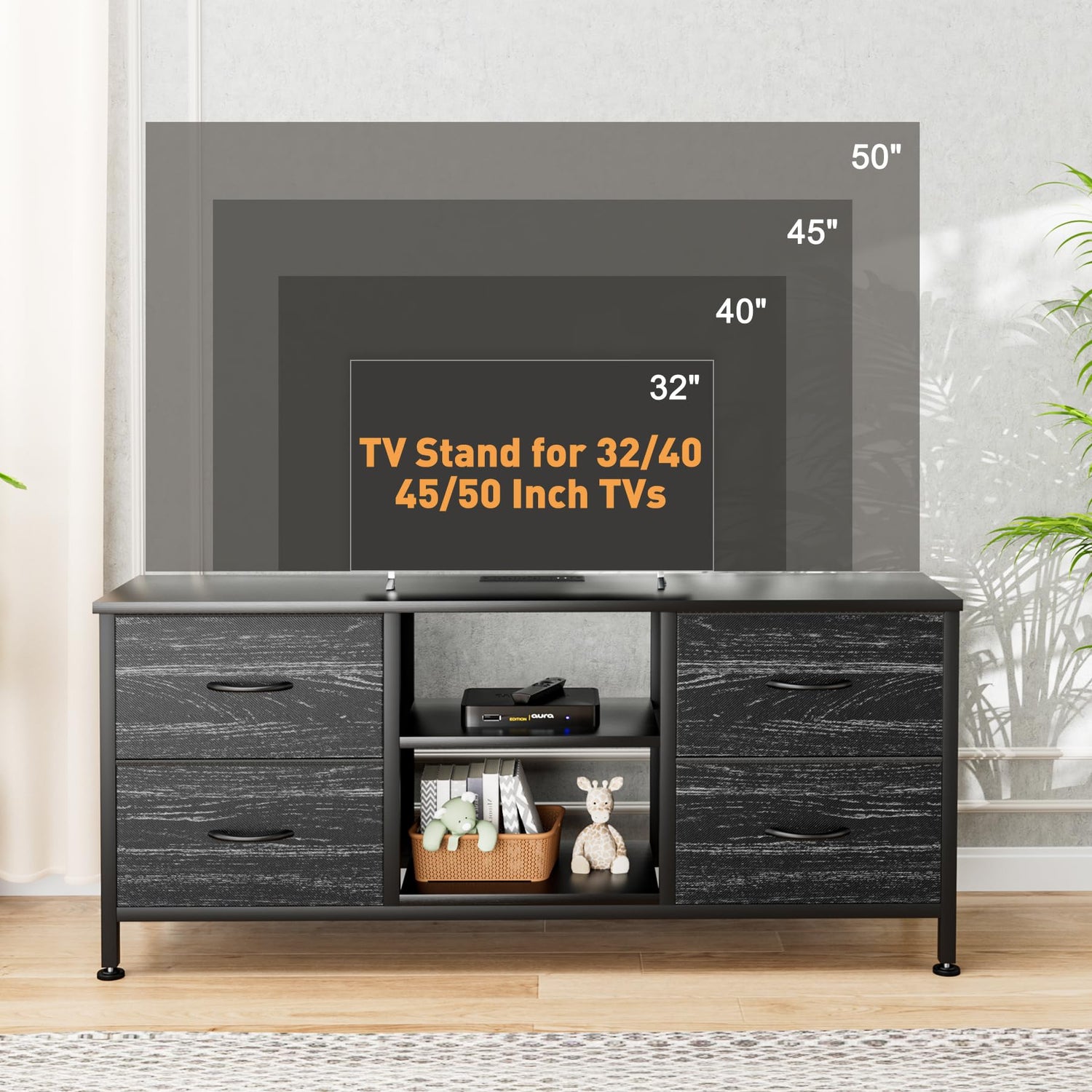 YaFiti TV Stand for Bedroom, Dresser TV Stand with 4 Fabric Drawers & Open Shelves for 50" TV, Entertainment Center with Power Outlet, Dresser for Bedroom, Living Room, Entryway, Black Wood Veins