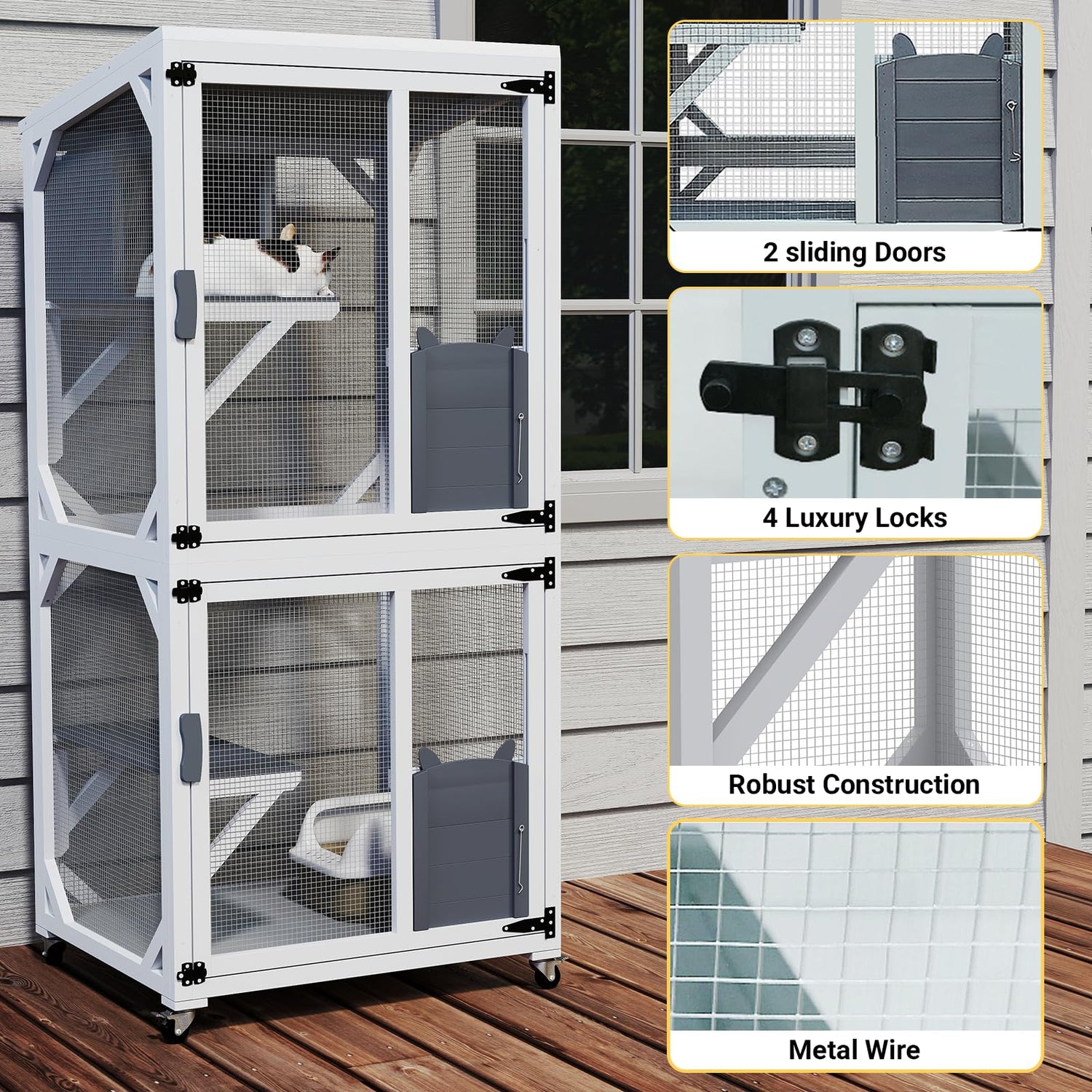 - Easy to move and clean: The Cat Condo Outdoor is equipped with 4 wheels, which can be easily moved between apartments, terraces, and balconies, realizing easy switching between indoors and outdoors, 2 of which are brake casters, which can be fixed to ensure safety. The bottom PVC layer can be removable for easy cleaning.