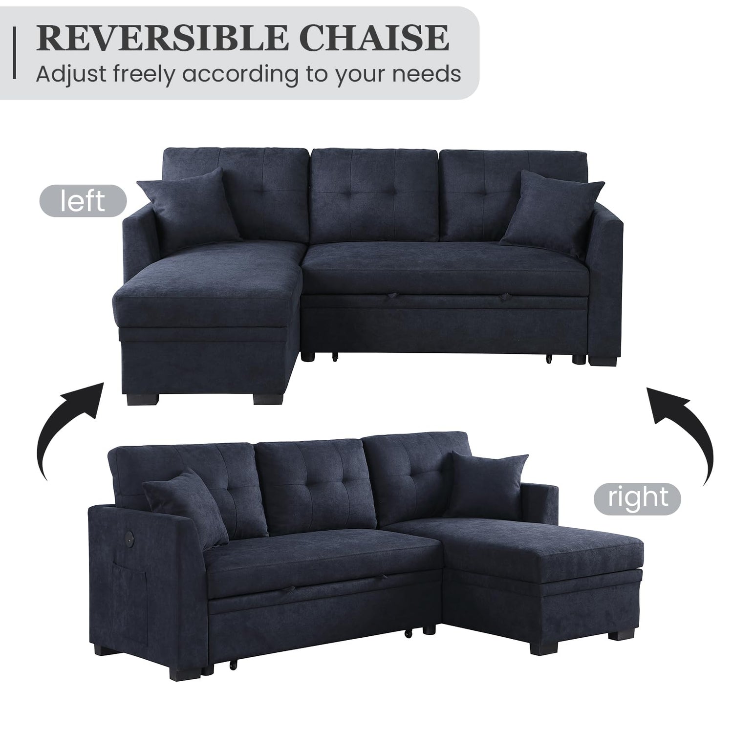 - Hidden Storage Space: Lift the chaise to reveal a concealed compartment for storing blankets and essentials, while integrated ports keep your devices powered.