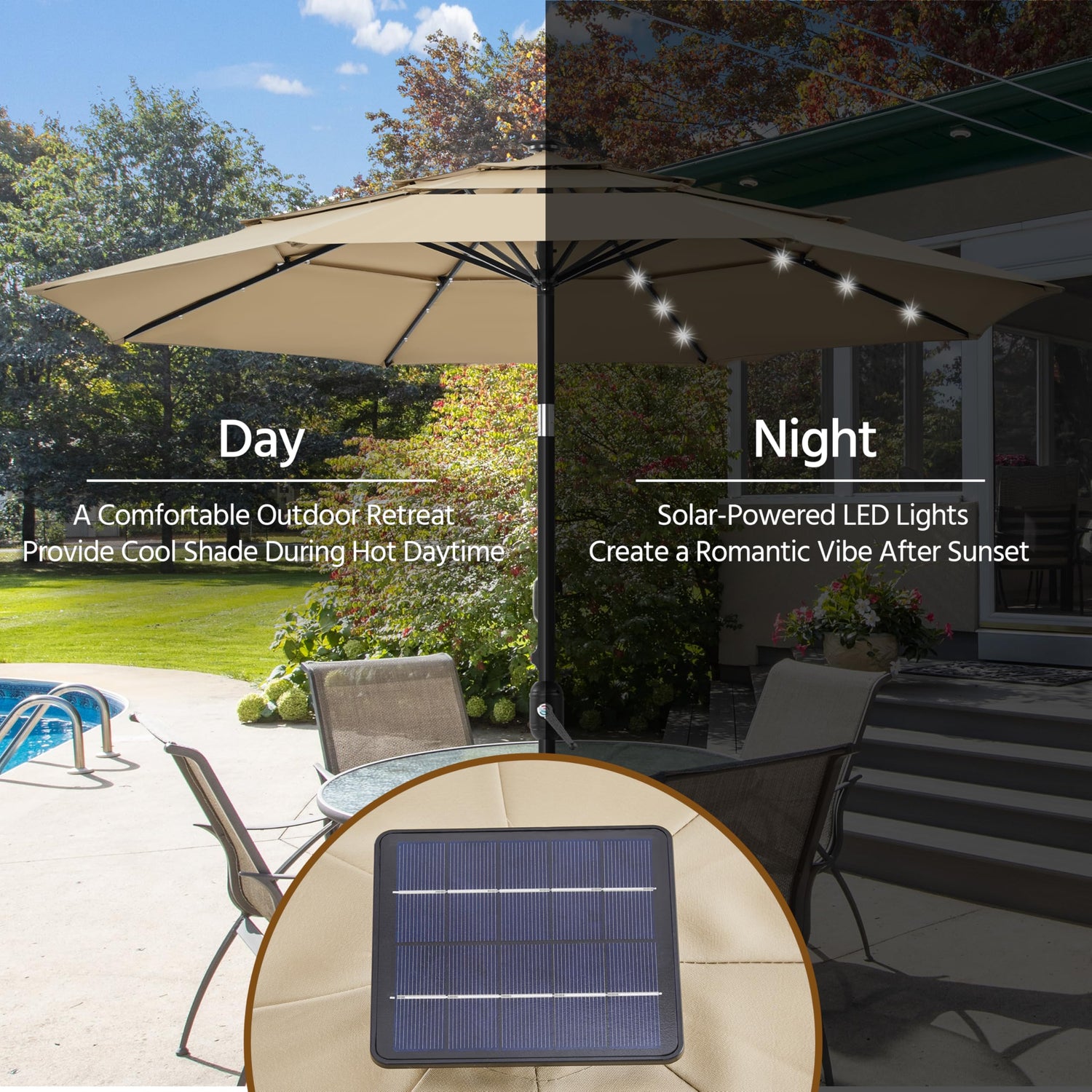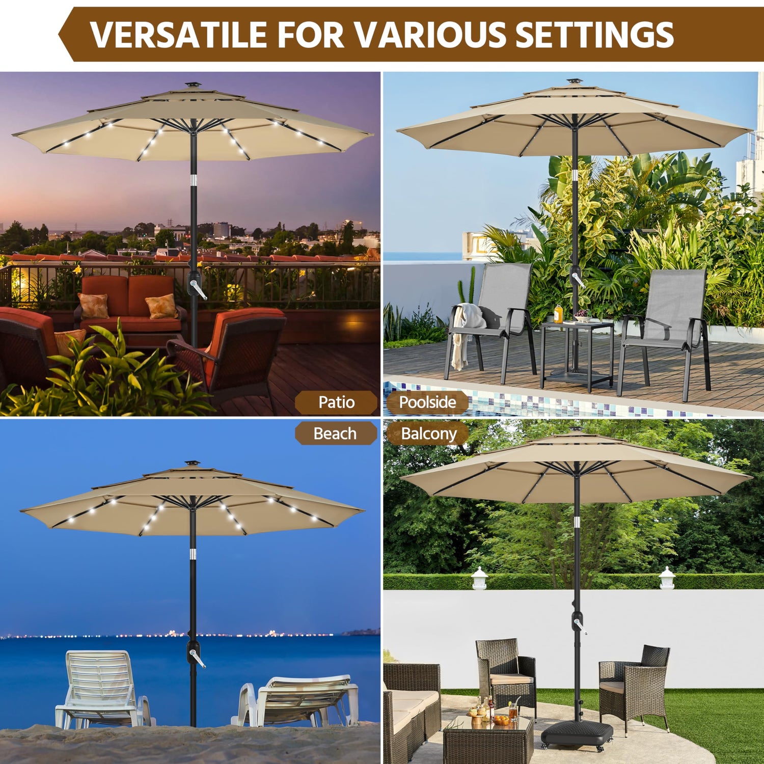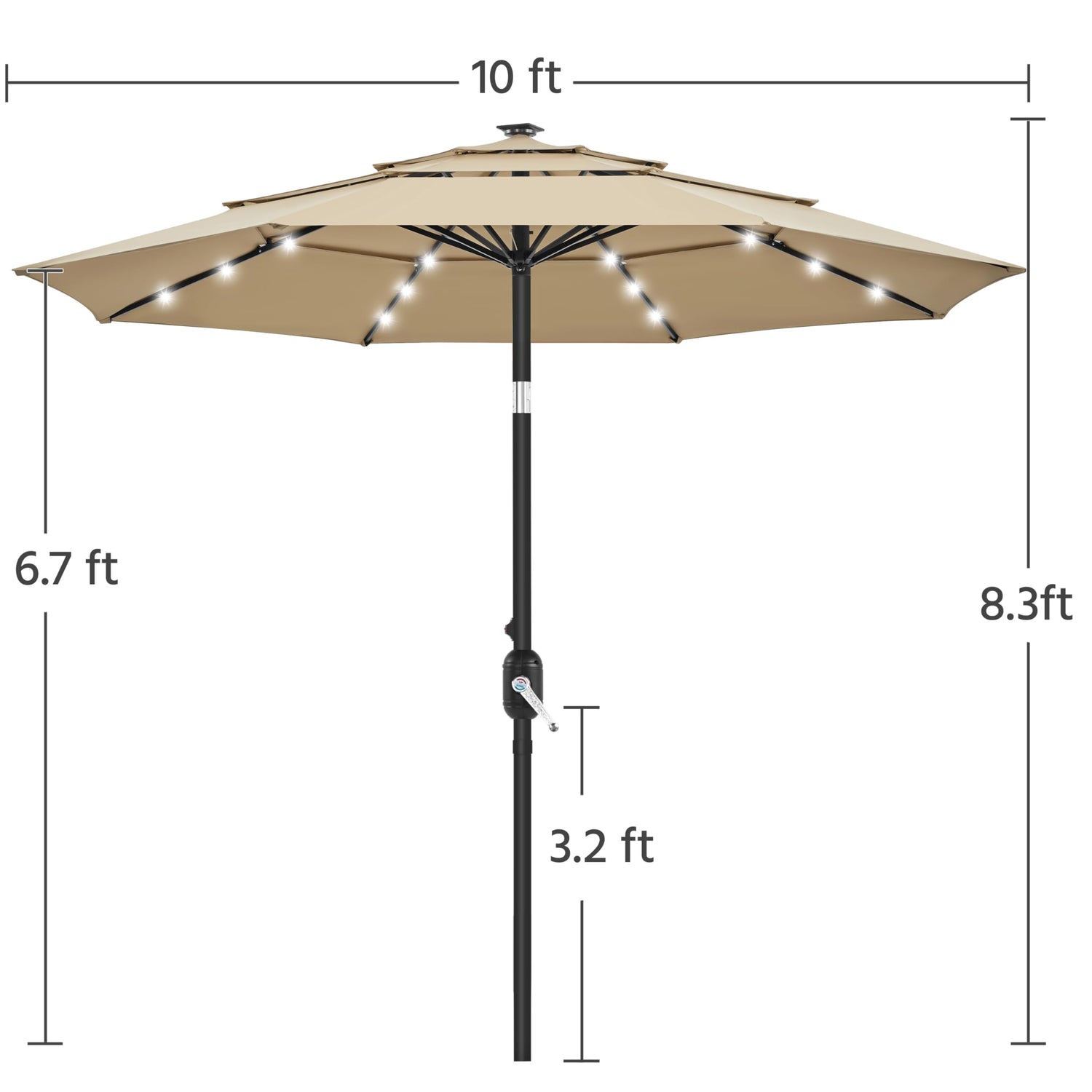 Yaheetech 10ft 3-Tier Vented Solar Patio Umbrella, Table Outdoor Market Umbrella with 24 LED Lights, 8 Sturdy Ribs Beach Umbrella with Tilt and Crank for Garden, Deck, Tan