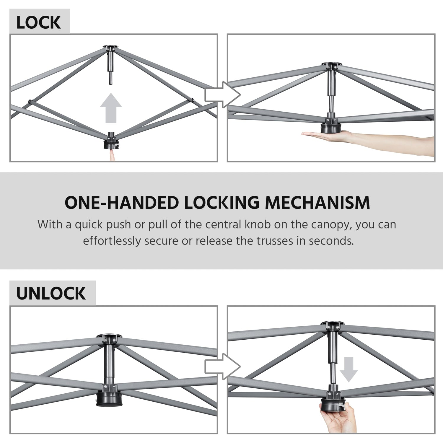 - One-push-to-lock Mechanism: Thanks to the one-push-to-lock mechanism, this canopy tent is effortless to set up. Open the frame, install the canopy fabric, push up the center pole to secure the trusses, adjust the legs to your desired height, and done