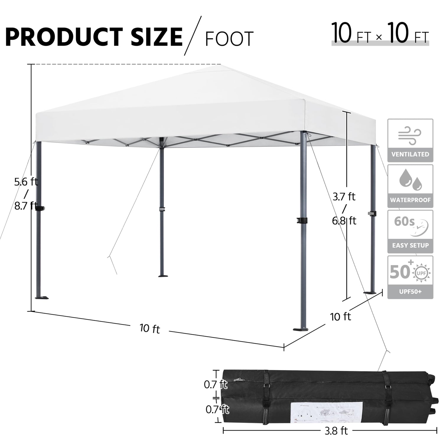 - Must-have For Outdoor Activities: With a generous size of 10ft × 10ft, this pop-up instant canopy provides a comfortable and cooling shady area spanning 100 sq. ft., accommodating 10 people. This canopy is versatile for various occasions, whether for backyard/beach parties, group tours, or large commercial events