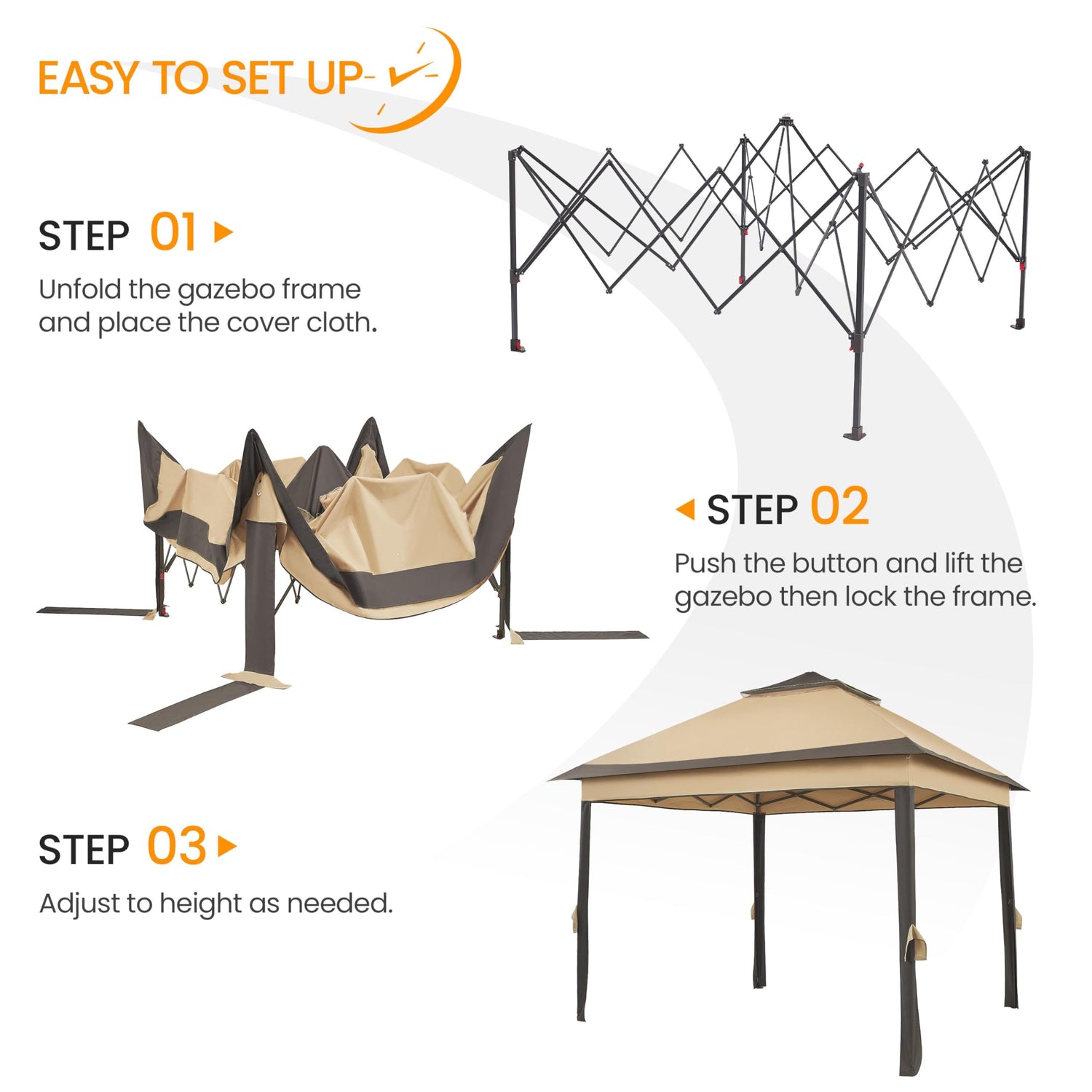 - Improved Versatility With Adjustable Heights: This 11 × 11ft gazebo tent features adjustable heights of 8.9', 9.2', and 9.5' to create an elevated and adaptable space for any event from outdoor dining to backyard parties