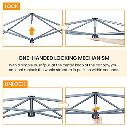 - One-push-to-lock Mechanism: Thanks to the one-push-to-lock mechanism, this canopy tent is effortless to set up. Open the frame, install the canopy fabric, push up the center pole to secure the trusses, adjust the legs to your desired height, and done