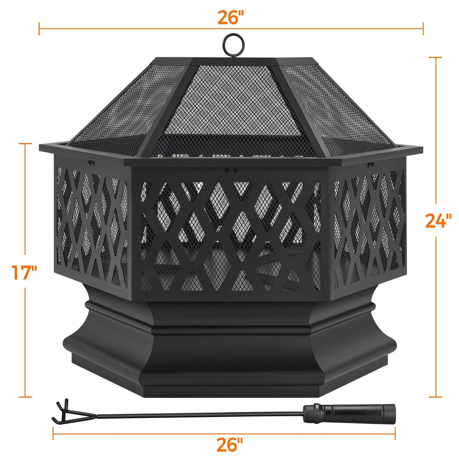 - 【Chic Backyard Addition】Designed in an elegant hexagon shape with woven mesh walls, this 26″ outdoor fireplace exudes elegance and charm. It is the perfect addition to any porch, backyard, or patio, setting the stage for unforgettable gatherings with loved ones in bonfire parties.
