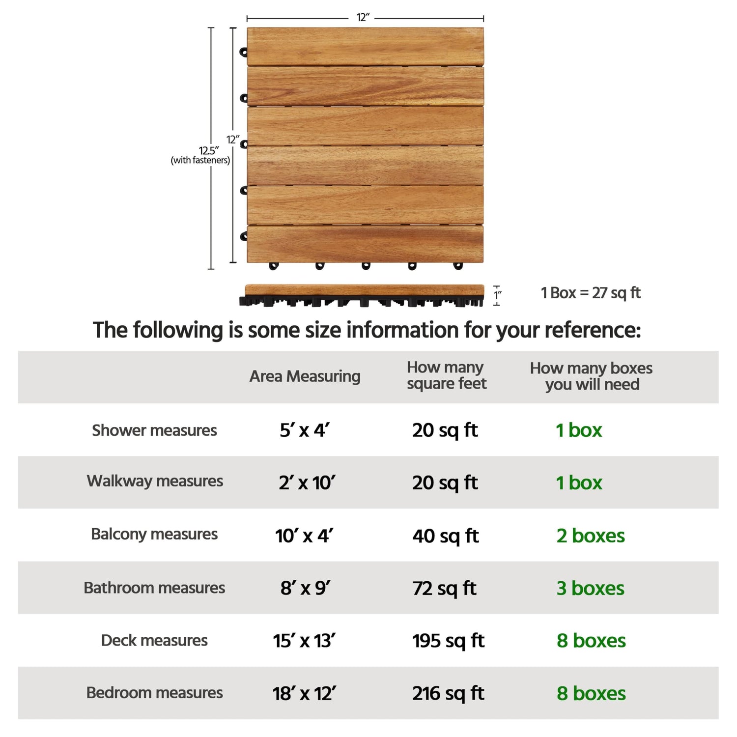 Details: Pack of 27 Wood Flooring Tiles, Waterproof Acacia Wood for Flooring, Wood Plastic Interlocking Flooring Tiles for Outdoor & Indoor Patio Garden Deck Poolside 12.5″ W × 12.5″ L
