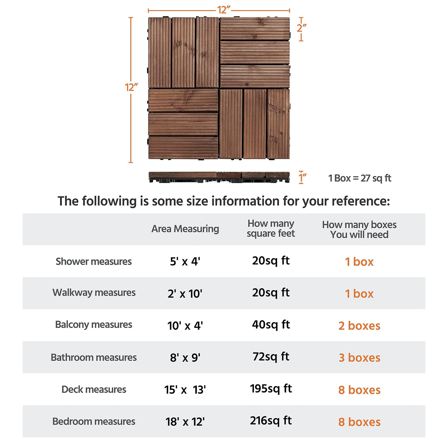 - 【Versatility】: The 27pcs fir wood flooring tiles are great building materials for a house renovation or patio design. You can place these tiles on any hard surface like cement, wood floor or carpet. Due to their good quality and durability, they can be perfectly applied to patio, balcony, bathroom and any indoor or outdoor, etc.
