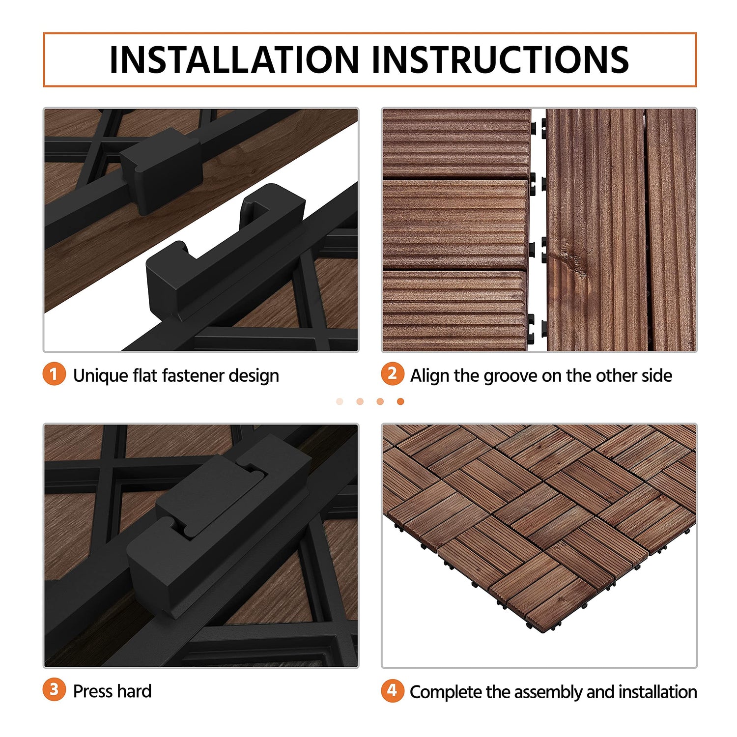 - 【Easy installation】: The wood flooring tiles were equipped with interlocking design, which makes it easy and quick to install these tiles. Like a puzzle, the interlocking snaps easily click together without tools required. Just use your imagination to create different shapes!