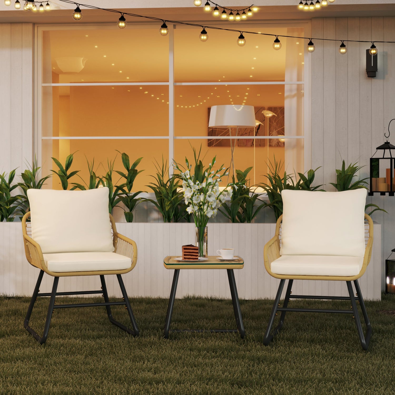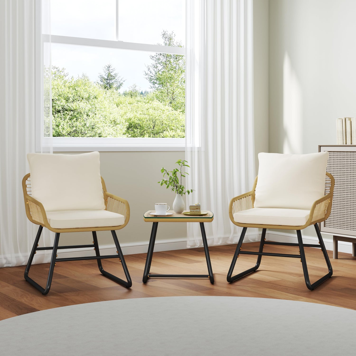 Yaheetech 3 Piece Patio Bistro Set Outdoor Wicker Bistro Furniture Sets, 2 Rattan Chairs and Glass Top Table for Patio, Balcony, Porch, Poolside, Backyard - Tan/Cream