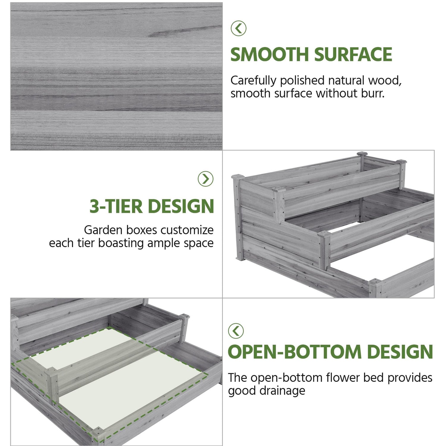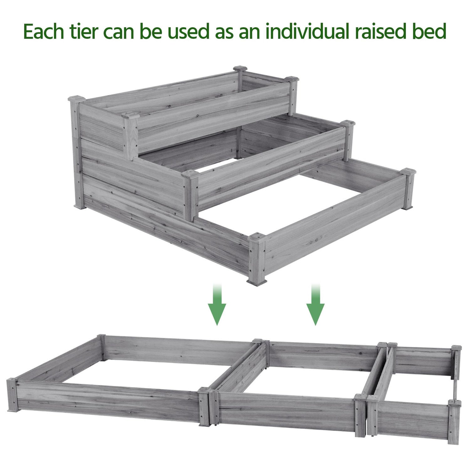 - Three-Tier Design: This elevated planter for horticulture provides three growing areas for different plants or planting methods. Each tier is jointed with wood plugs, which allows this three-tier garden bed to be easily turned into three separate growing beds of different sizes if needed