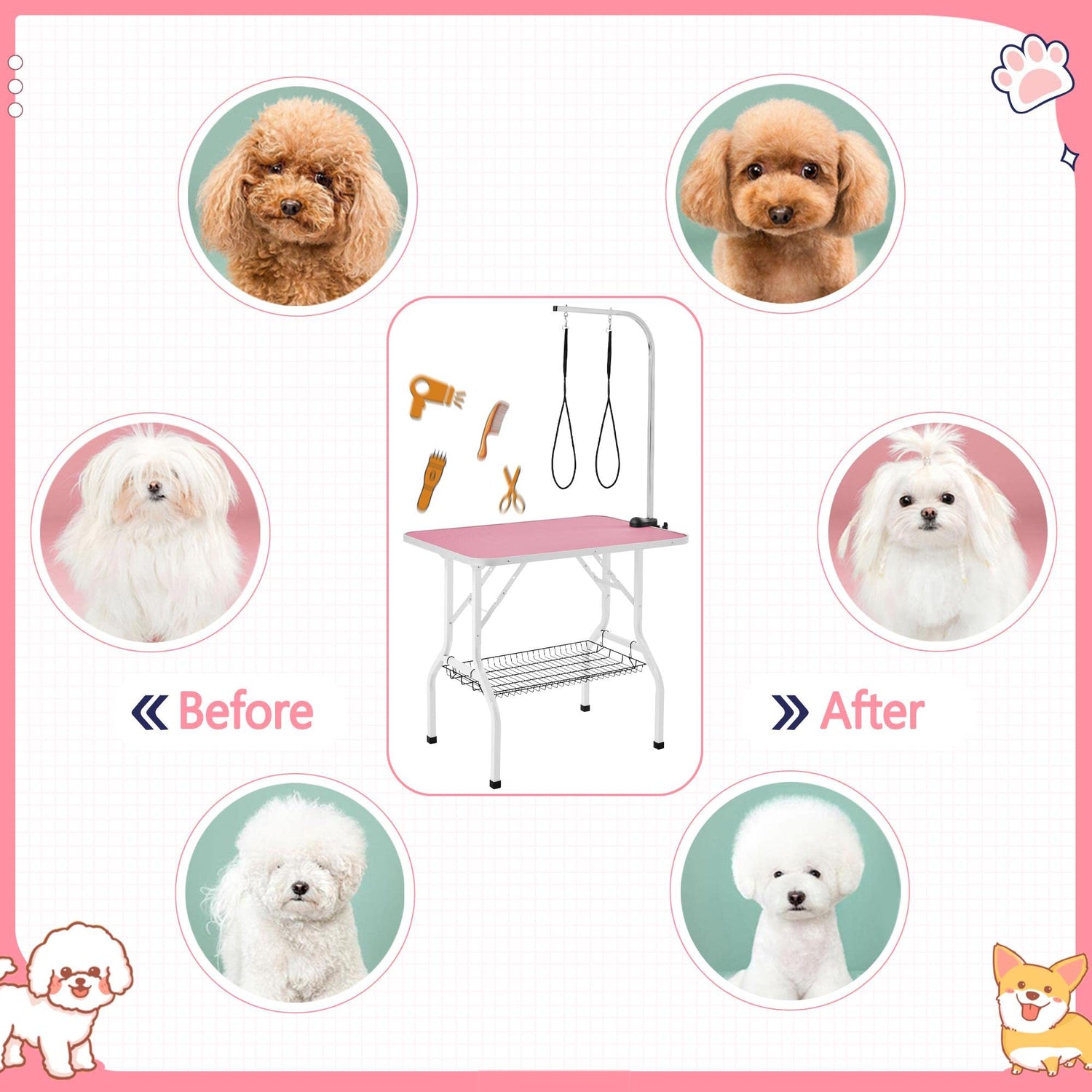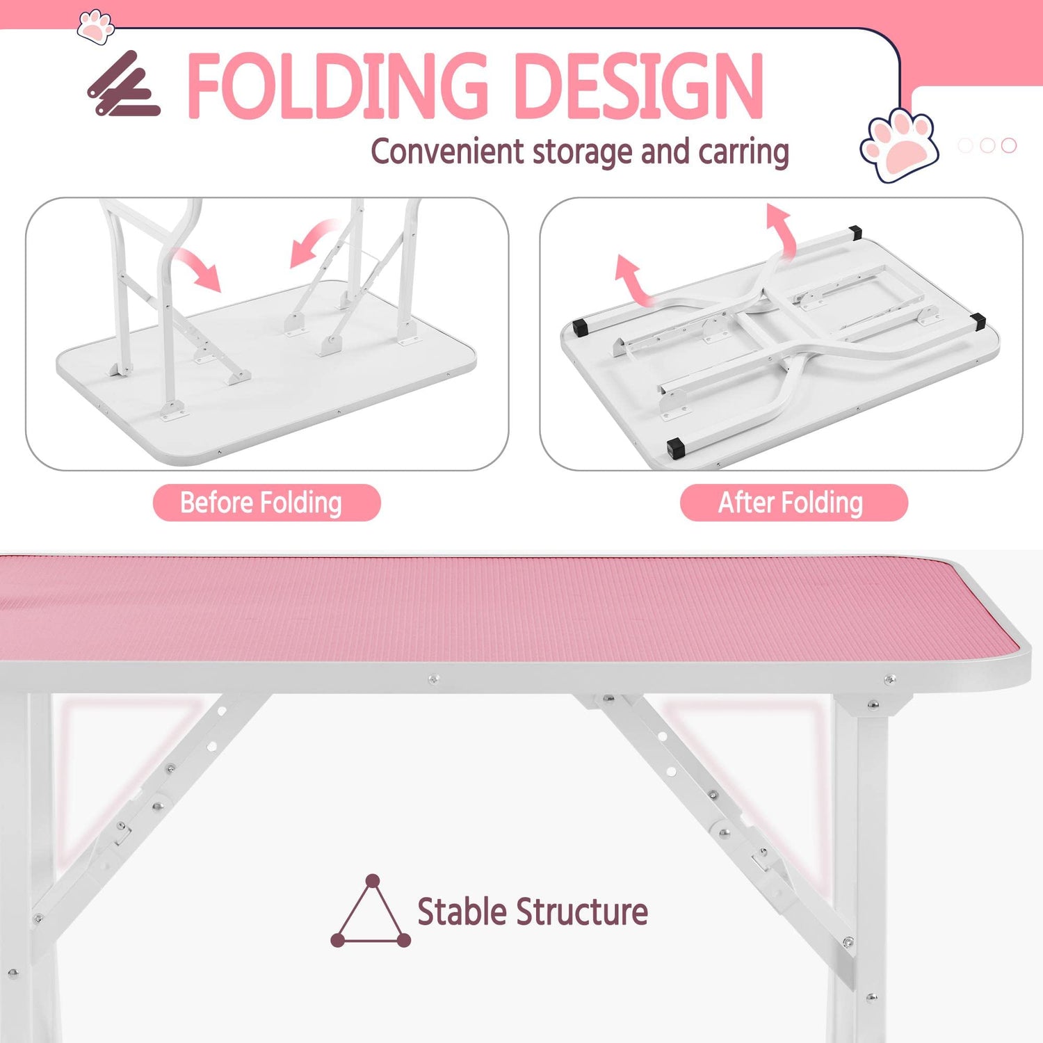 Details: 36” Dog Grooming Table with Basket Style Tool Shelf and Adjustable Arm Fold-up Pet Salon Table for Dogs/Cats Basically, the tabletop has an approximate measurement of 36”L x 24”W in overall size and 220lb in loading capacity, and it fits for a variety of pets from small to medium large. Also, its folding design will give you much convenience to carry around from one place to another. In addition, under the table is a basket style tool shelf for your easy access to everything you need during pet grooming. Besides, the grooming arm is detachable and height adjustable, and you can use the clamp and arm on other matching tabletop if necessary. Specifications: Material: MDF, PVC, aluminum, iron Color: pink Overall dimension: 36'' L x 24'' W x 63'' H Table unfolded dimension: 36'' L x 24'' W x 31.5'' H Table folded dimension: 36'' L x 24'' W x 3.3'' H Adjustable arm dimension: 33.3'' L x 17.7'' W Grooming loop length: 23.6'' Tool shelf dimension: 26'' L x 15'' W x 1.5'' H Load capacity (max.): Grooming table: 221lb; Tool shelf: 22lb N. W.: 29.5lb G. W.: 33.5lb Packing List: Pet Grooming Table x 1 Assembly Instructions x 1