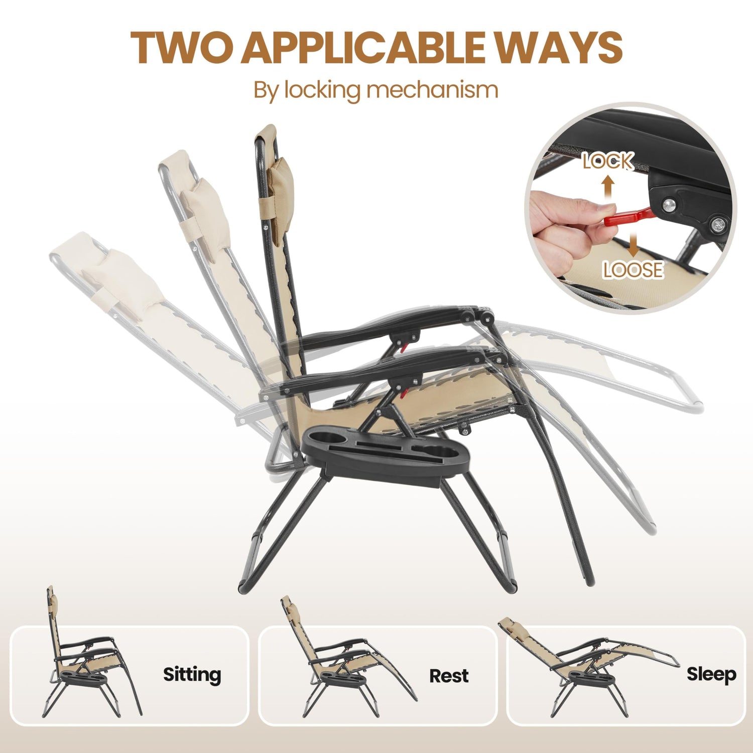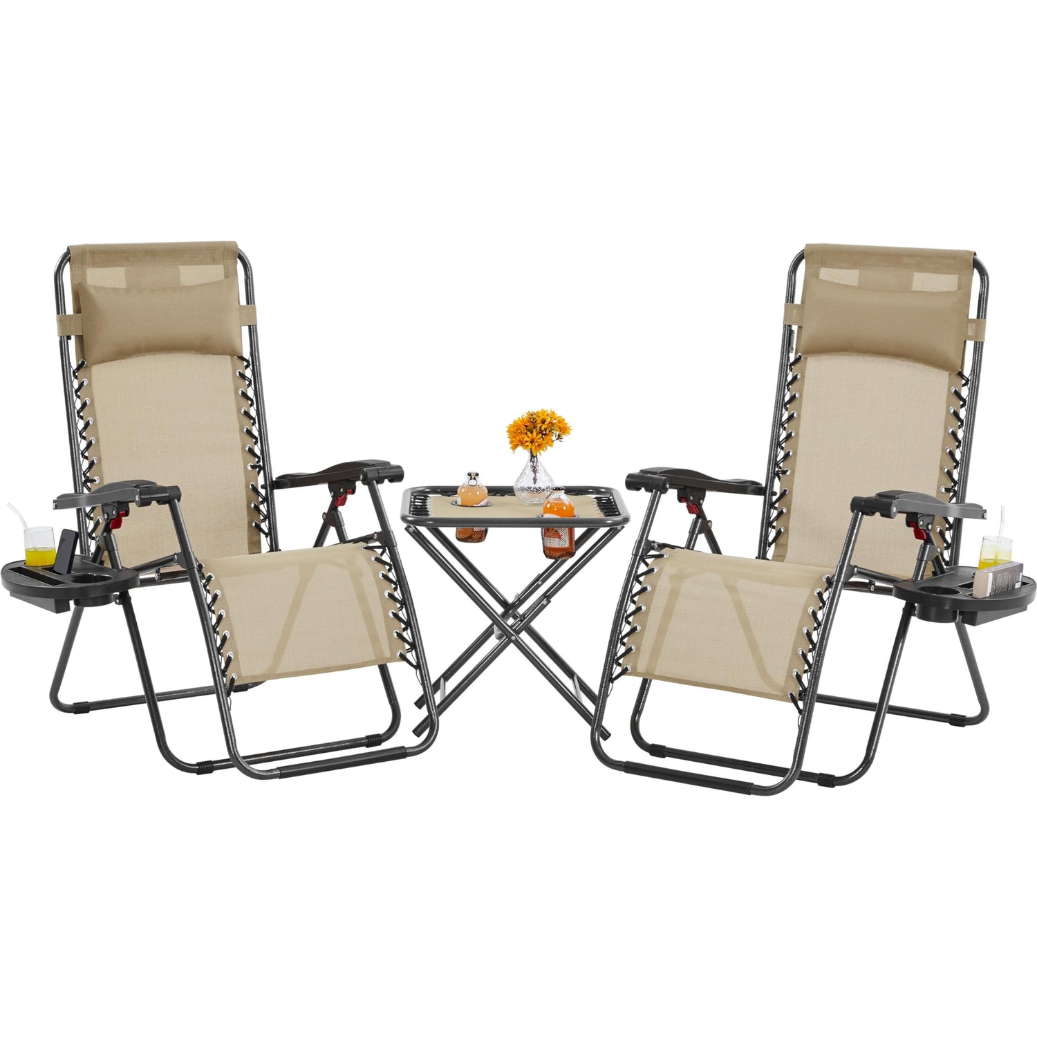 Yaheetech 3PCS Zero Gravity Recliner Portable Outdoor Reclining Chair Set w/Side Table Folding Chaise Lounge Chairs for Patio Beach Deck Garden Pool Beige