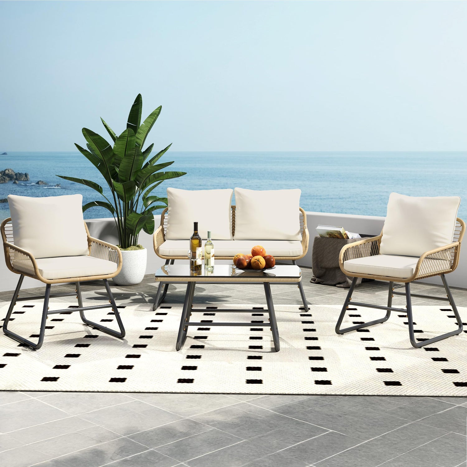 Yaheetech 4 Piece Patio Furniture Set, Outdoor Wicker Conversation Sets, Boho Loveseat & 2 Armchairs with Cushion and Pillow, Glass Top Table for Backyard, Porch, Balcony, Deck - Tan/Cream