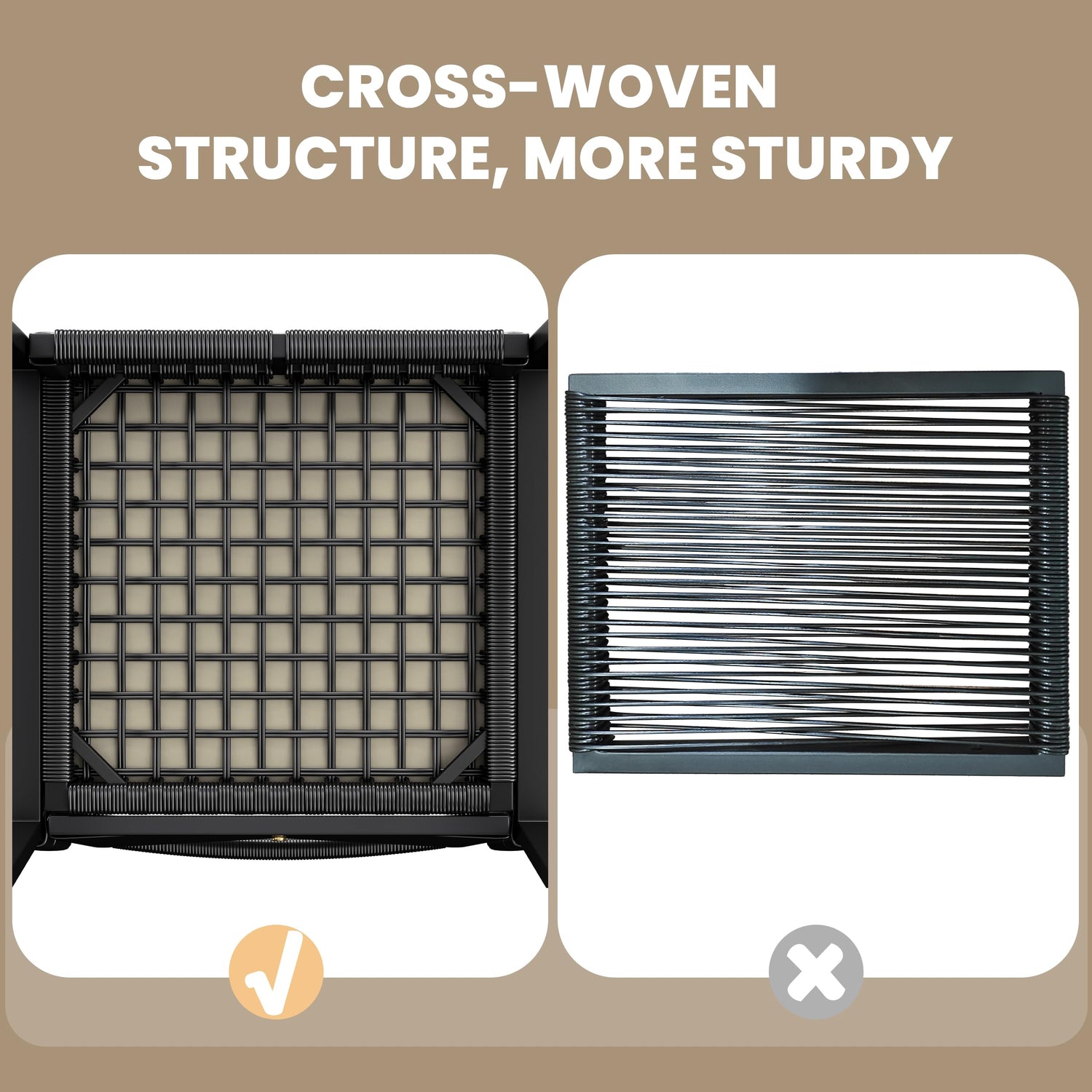 - Steady Construction: Featuring cross-woven rattan at the bases of seats and ottomans, paired with metal frames, this furniture set is built to last. Each chair holds up to 136 kg, and each ottoman holds up to 68 kg