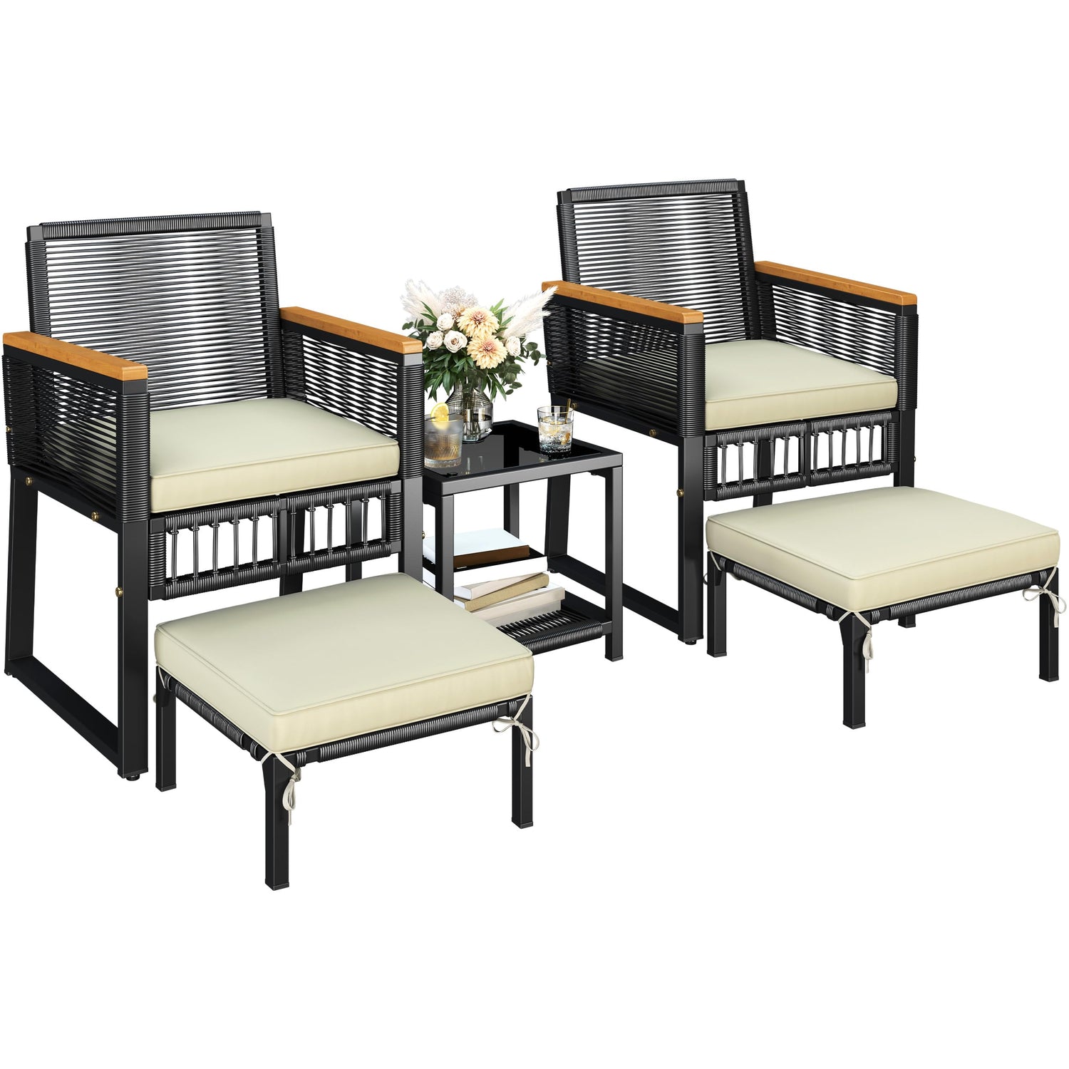 Yaheetech 5-Piece Outdoor Conversation Set, Wicker Rattan Patio Furniture Set w/Rattan Armchairs, 2-Layer Side Table, Ottomans, Acacia Wood Armrests & Metal Frame for Backyard, Porch, Balcony