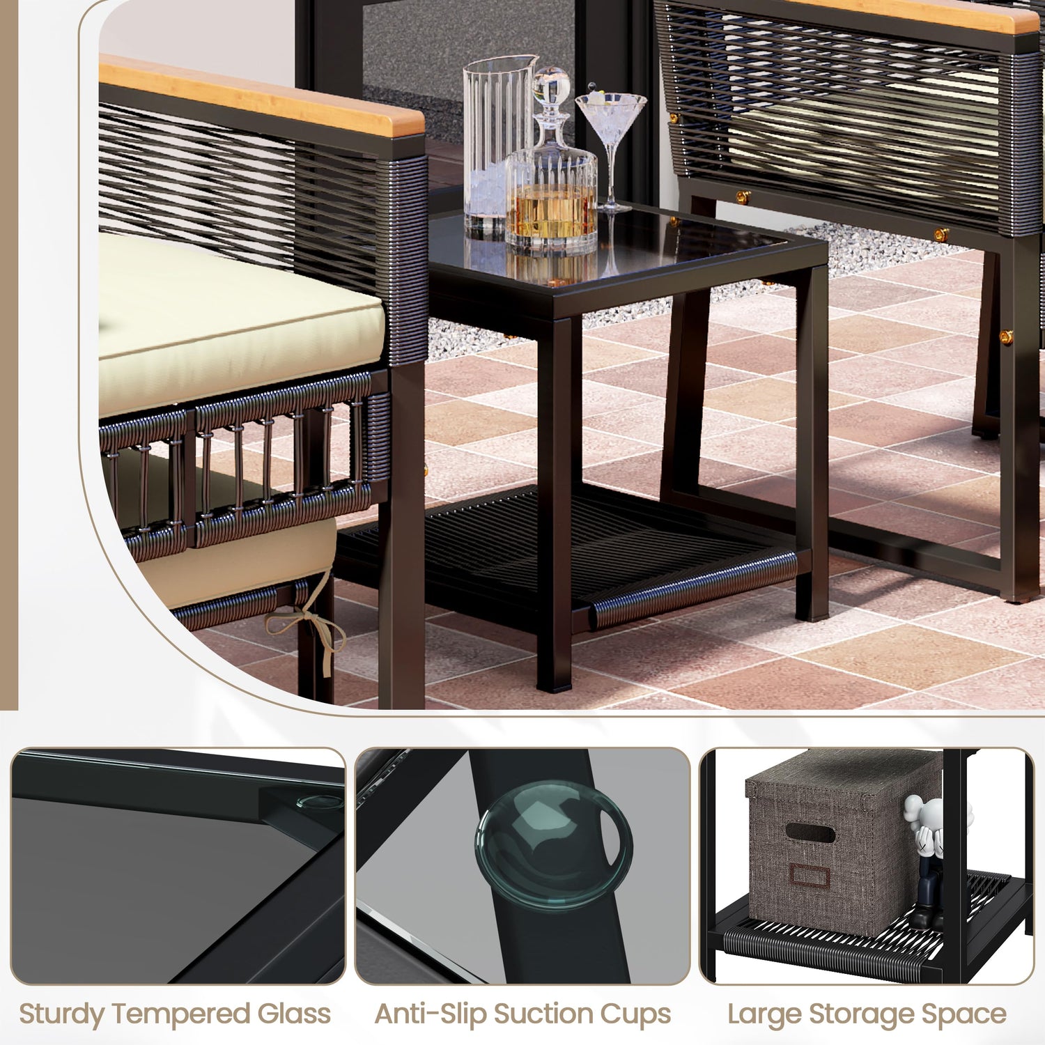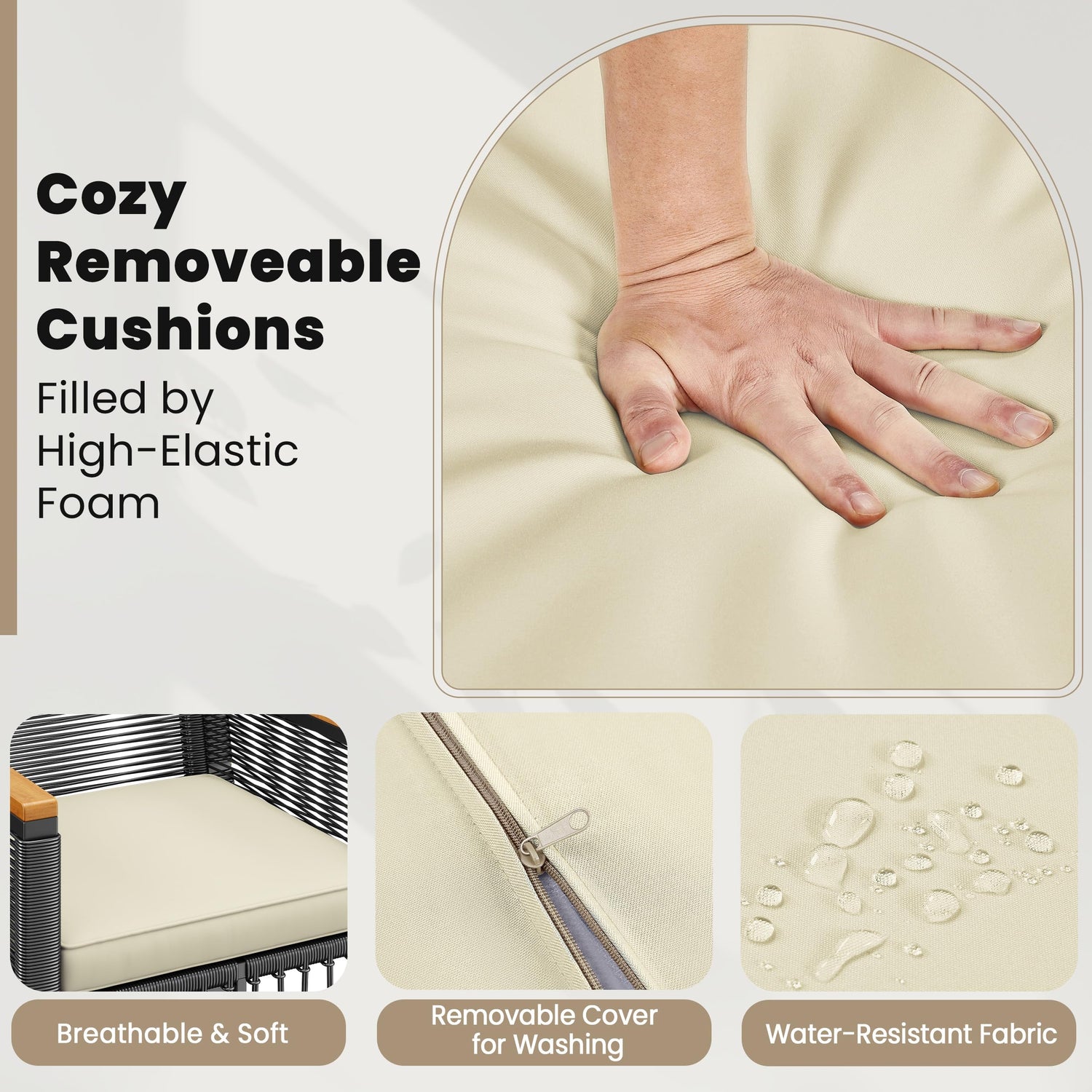 - Water-resistant Cushions & Rattan: Both the cushion covers and handwoven rattan are water-resistant, ensuring the patio conversation set remains durable and can be left outdoors in all conditions