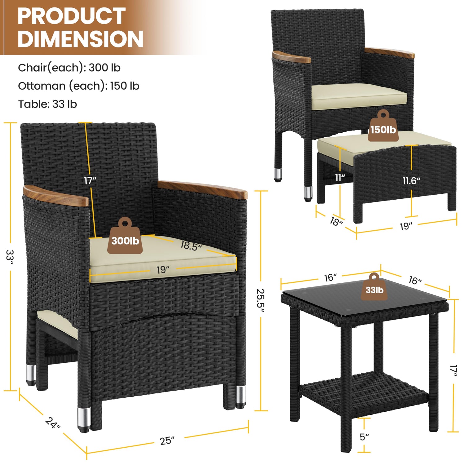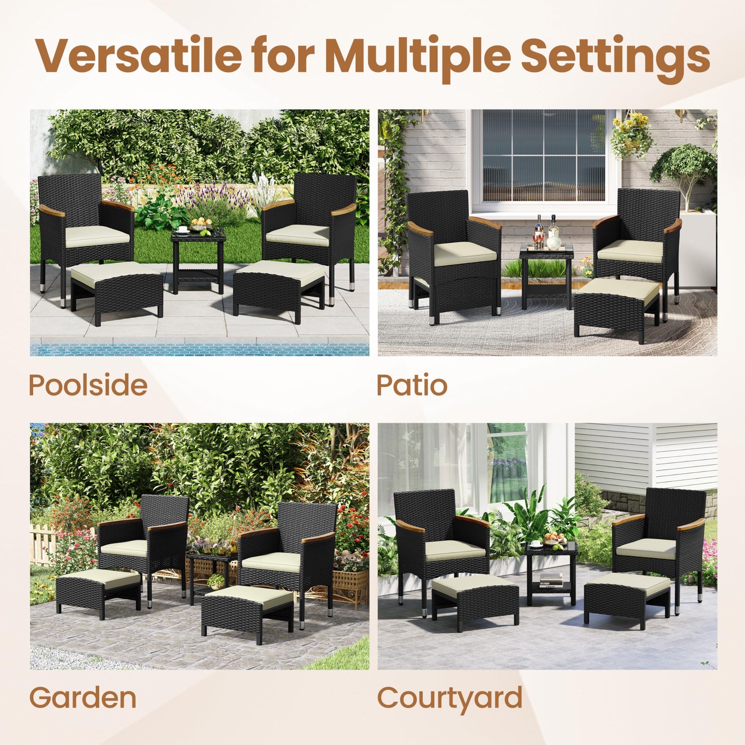 - 5-Piece Patio Furniture Set: This 5-piece rattan patio set includes two comfortable accent chairs, two ottomans, and a sleek coffee table with a tempered-glass top. Expertly hand-woven, this rattan set is designed for 2–4 people to relax and unwind in your garden, by the pool, or on the balcony