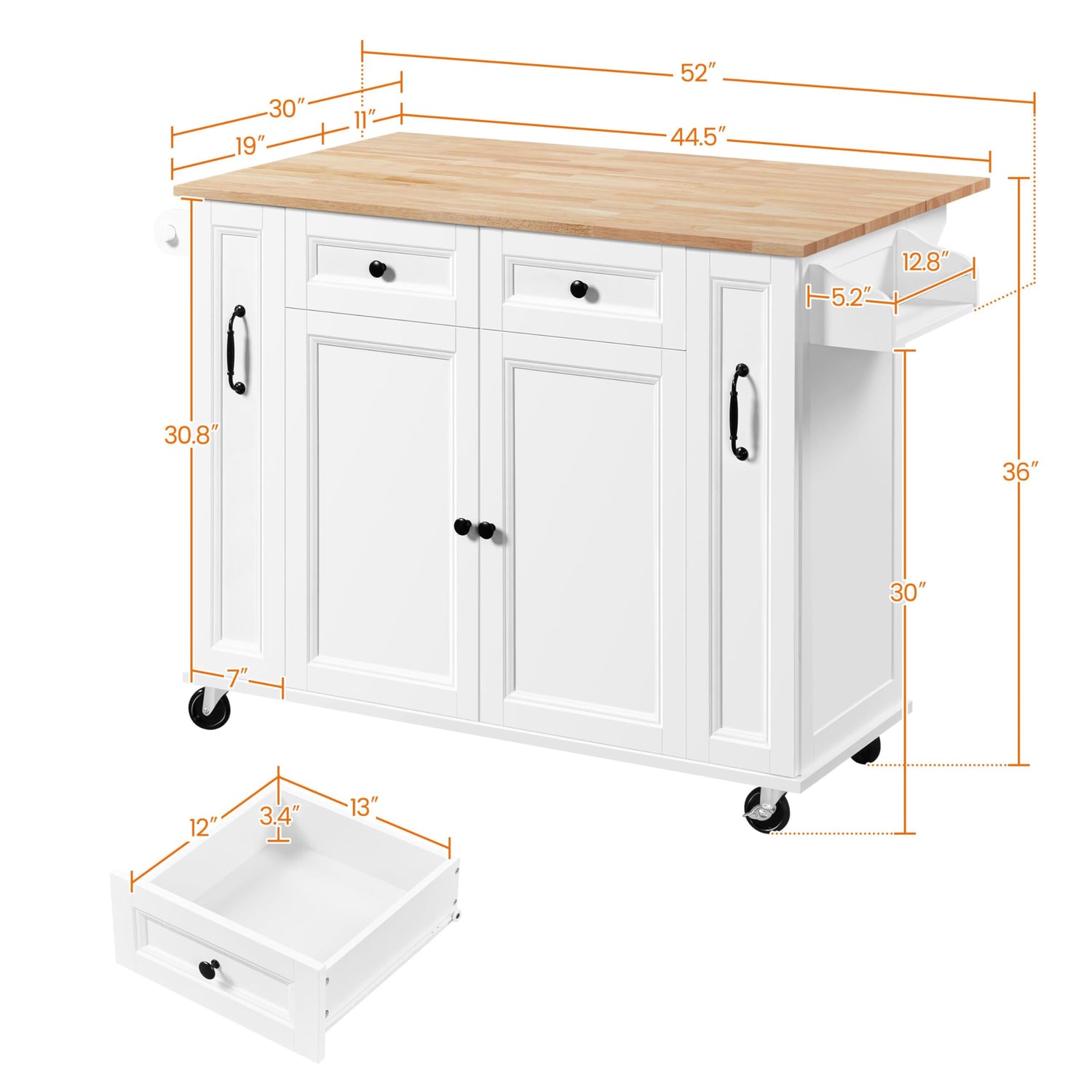 Yaheetech 52"W Kitchen Island with Drop-Leaf Breakfast Bar and 2 Pull-outs, Kitchen Cart on Lockable Wheels with Rubberwood Top & 2 Drawers & Adjustable Shelves, Storage Cabinet for Dining Room, White