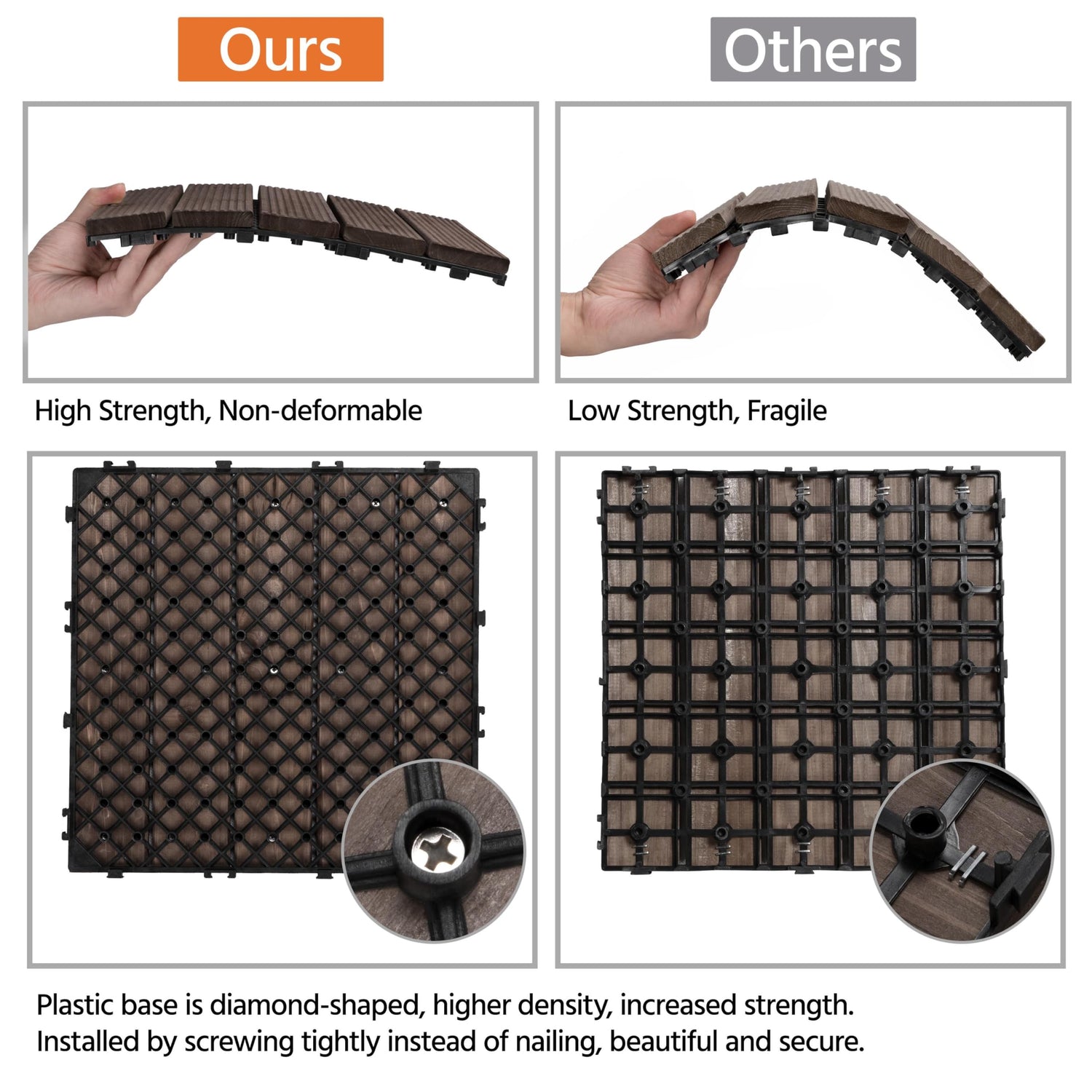 - 【Selected Material of Fir Wood】Sold in 5 sets. Each set includes 11 pieces. Our 12” interlocking wood tile is crafted out of natural solid fir wood and a durable polypropylene base. Treated with a high-temperature drying process, these wood tiles do not easily go bad even in the high humidity environment.