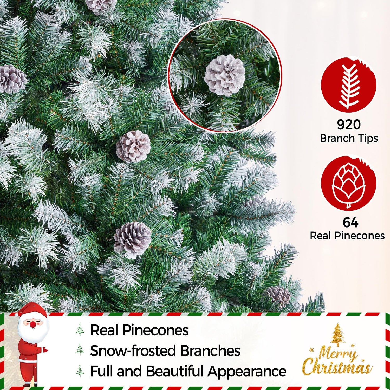 Yaheetech 6ft Artificial Christmas Tree, Snow Flocked Christmas Tree w/64 Pinecones, 920 Frosted Tips, Pre-Decorated Tree for Holiday Party Decoration